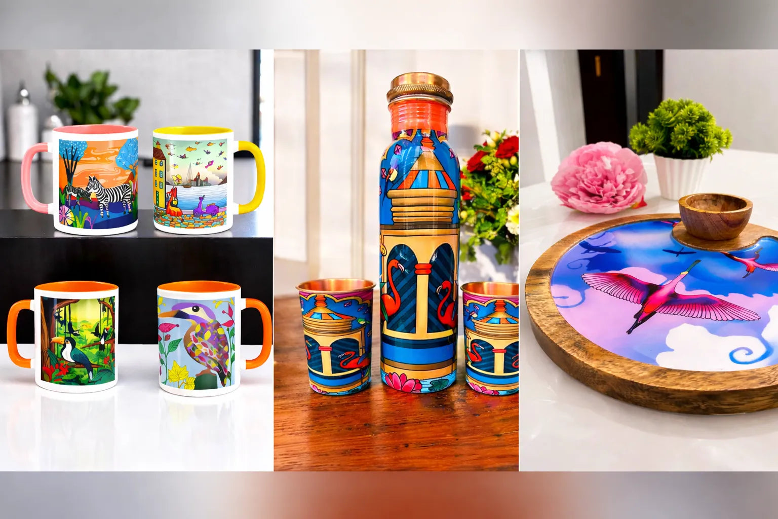 PaintzStories' tableware collection infuses art into everyday dining with artistic mugs, copper bottles, and handcrafted wooden cutlery, including bowls, platters, trays, and coasters. Featuring drawings by global artists, each piece reflects art inclusivity, merging cultural heritage with functionality. Ideal for gifting, these elegant designs elevate serving and home décor, bringing creativity and sophistication to any space.