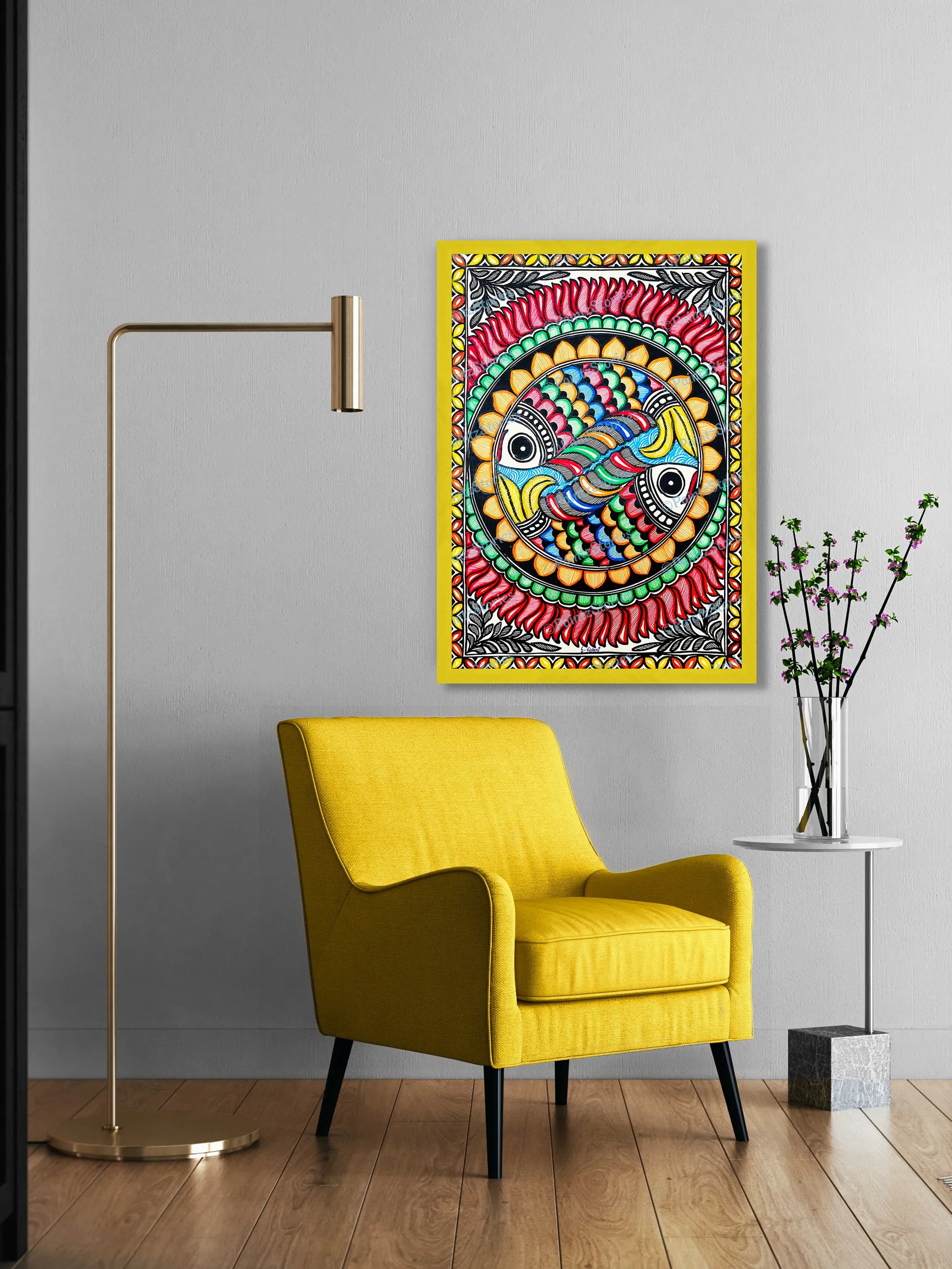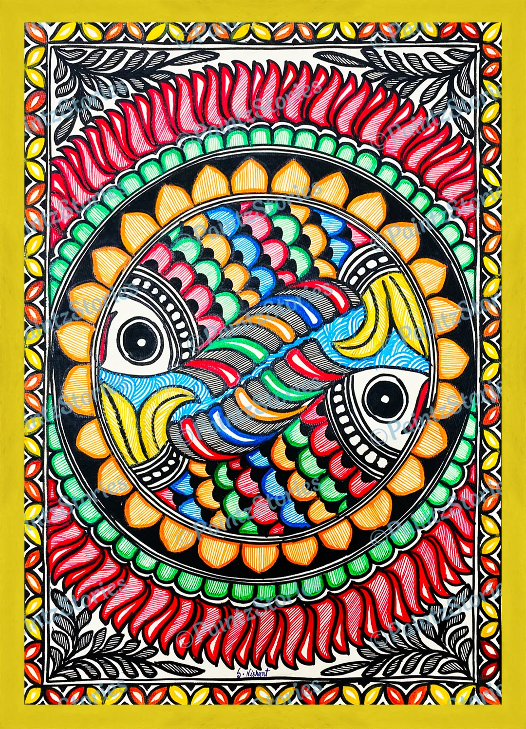 This stunning and colourful Madhubani/Mithila painting was made by a renowned artist Ms. Seema Nishant. In the Mithila society, this painting of a pair of fish represents a lucky charm.