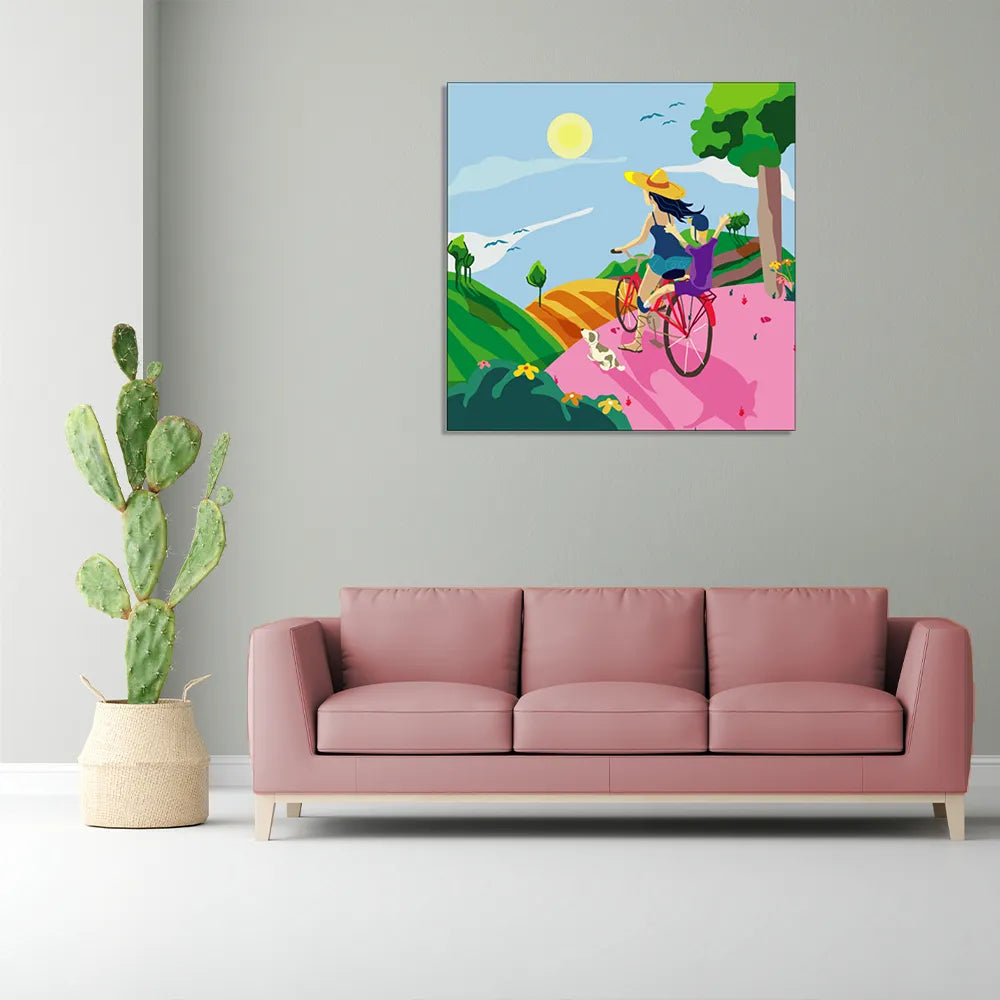 "Summer Adventure: A Joyful Doodle Illustration of Mother and Child Cycling Through Wheat Fields" Canvas Print I Wall Décor I Art work I 2 Feet *2 Feet I Art on Wall I Authentic Art I