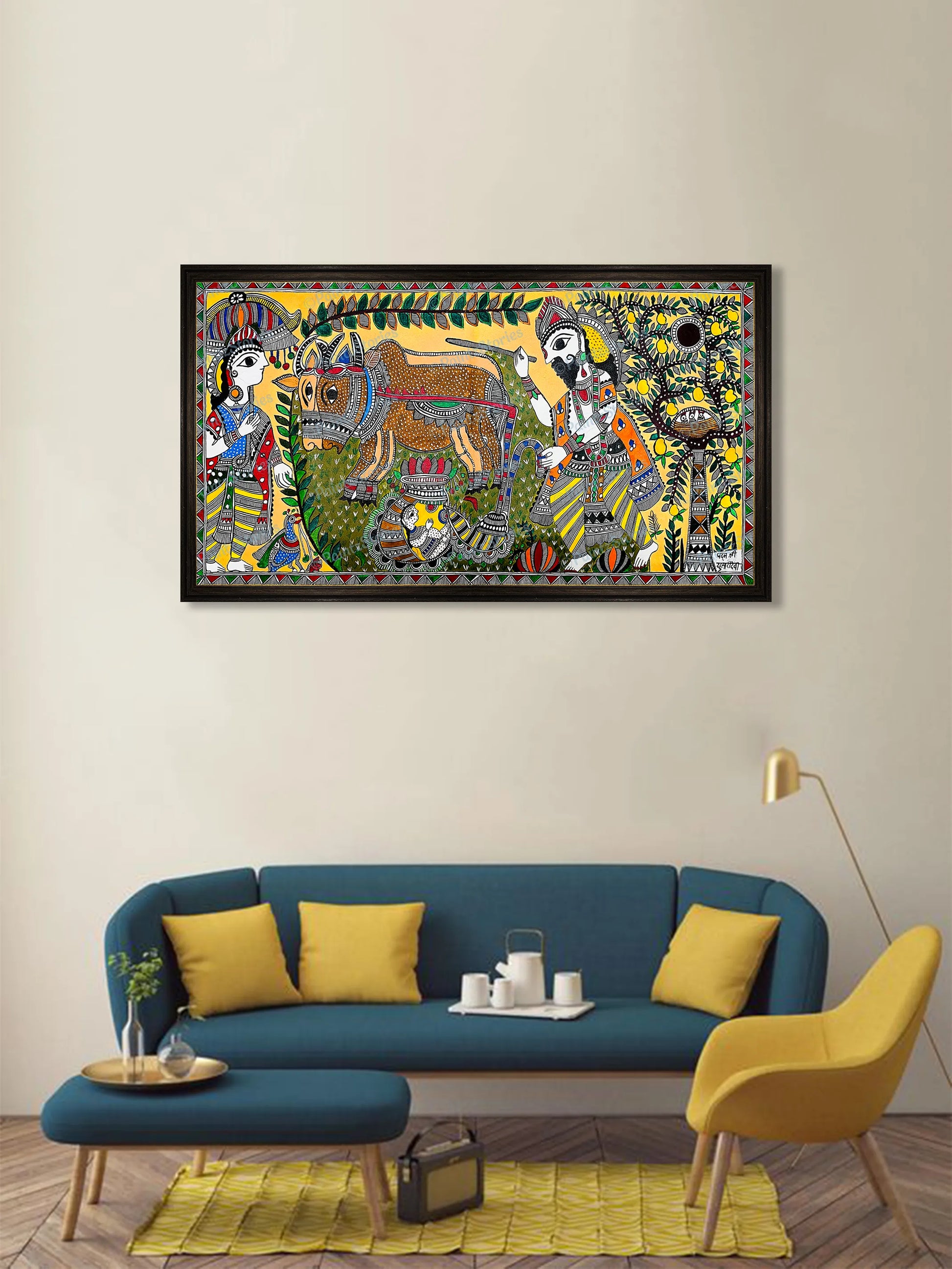 "Immerse yourself in the vibrant tradition of Madhubani painting (also called Mithila painting), where every brushstroke narrates a tale. Our authentic Madhubani artworks epitomize India's cultural richness with intricate designs, vivid hues, and meaningful symbols. Crafted by skilled artisans, each piece is a handmade masterpiece, offering a distinctive touch to your bedroom decor, living room decor, or wall decor, and honouring the artistic heritage of our nation."