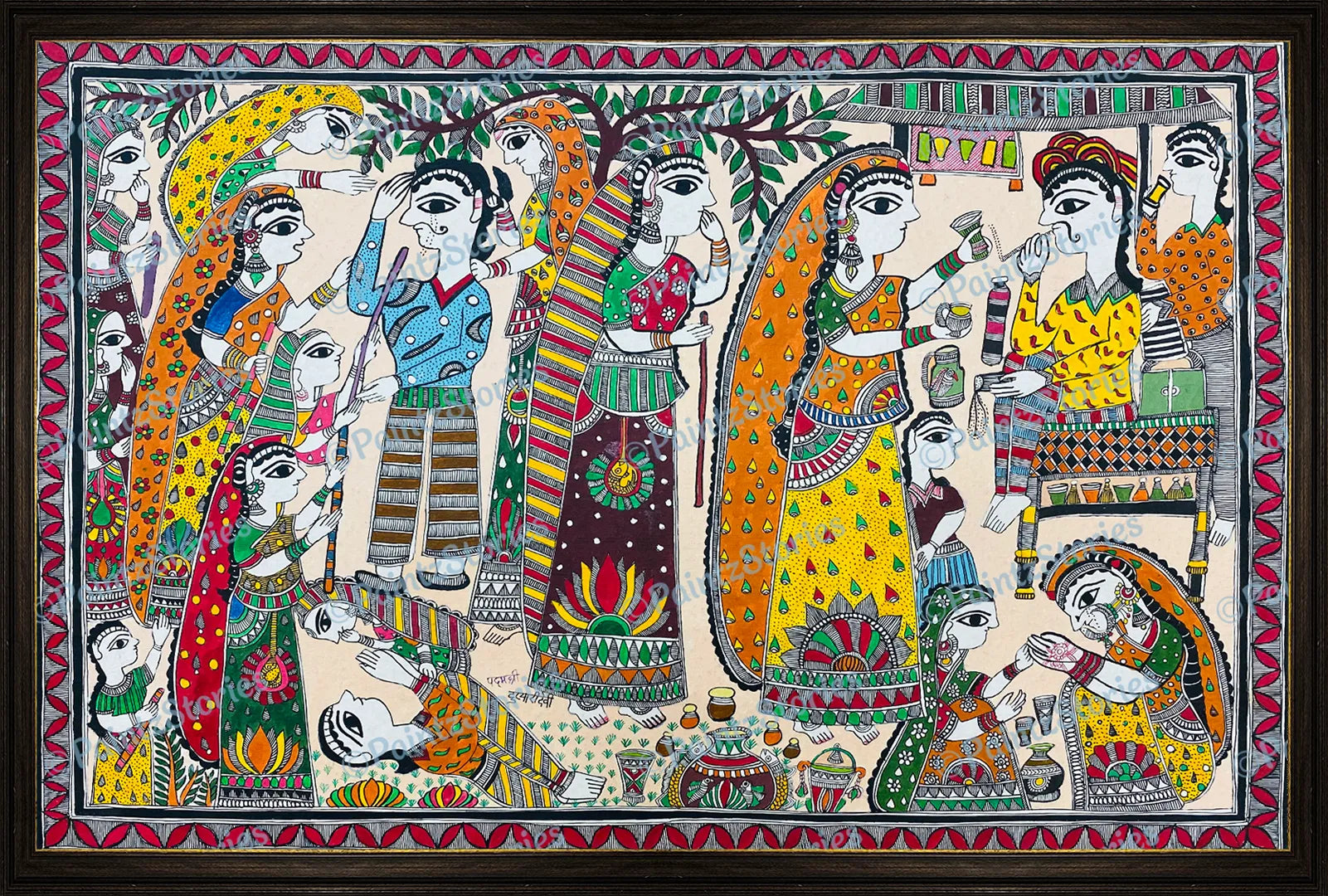 This Madhubani painting is beautifully drawn on handmade paper by Padma Shri Ms. Dulari Devi. In this painting she has tried to raise a very sensitive topic of drinking alcohol and its repercussions on the village women and families.