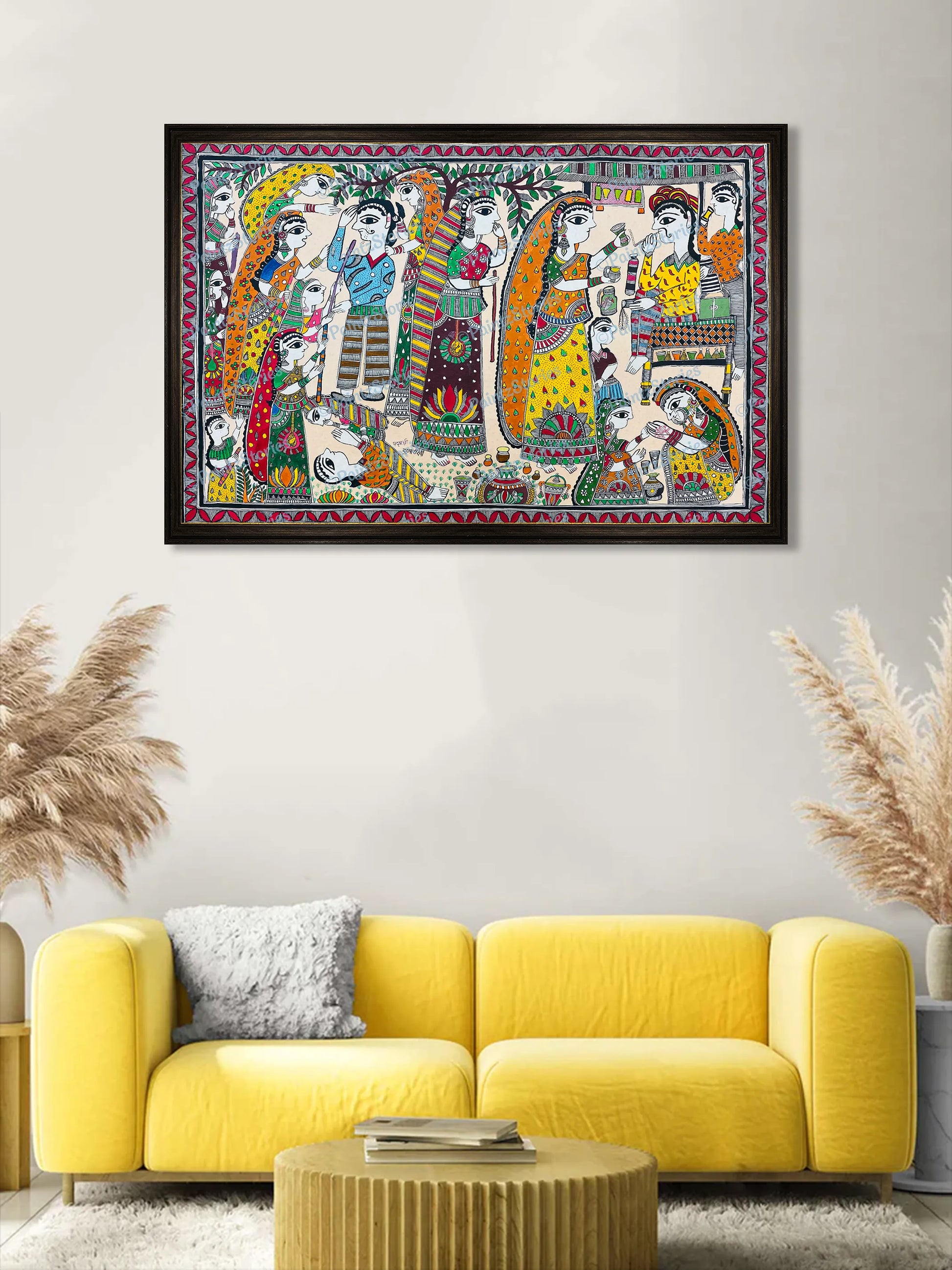 "Immerse yourself in the vibrant tradition of Madhubani painting (also called Mithila painting), where every brushstroke narrates a tale. Our authentic Madhubani artworks epitomize India's cultural richness with intricate designs, vivid hues, and meaningful symbols. Crafted by skilled artisans, each piece is a handmade masterpiece, offering a distinctive touch to your bedroom decor, living room decor, or wall decor, and honouring the artistic heritage of our nation."