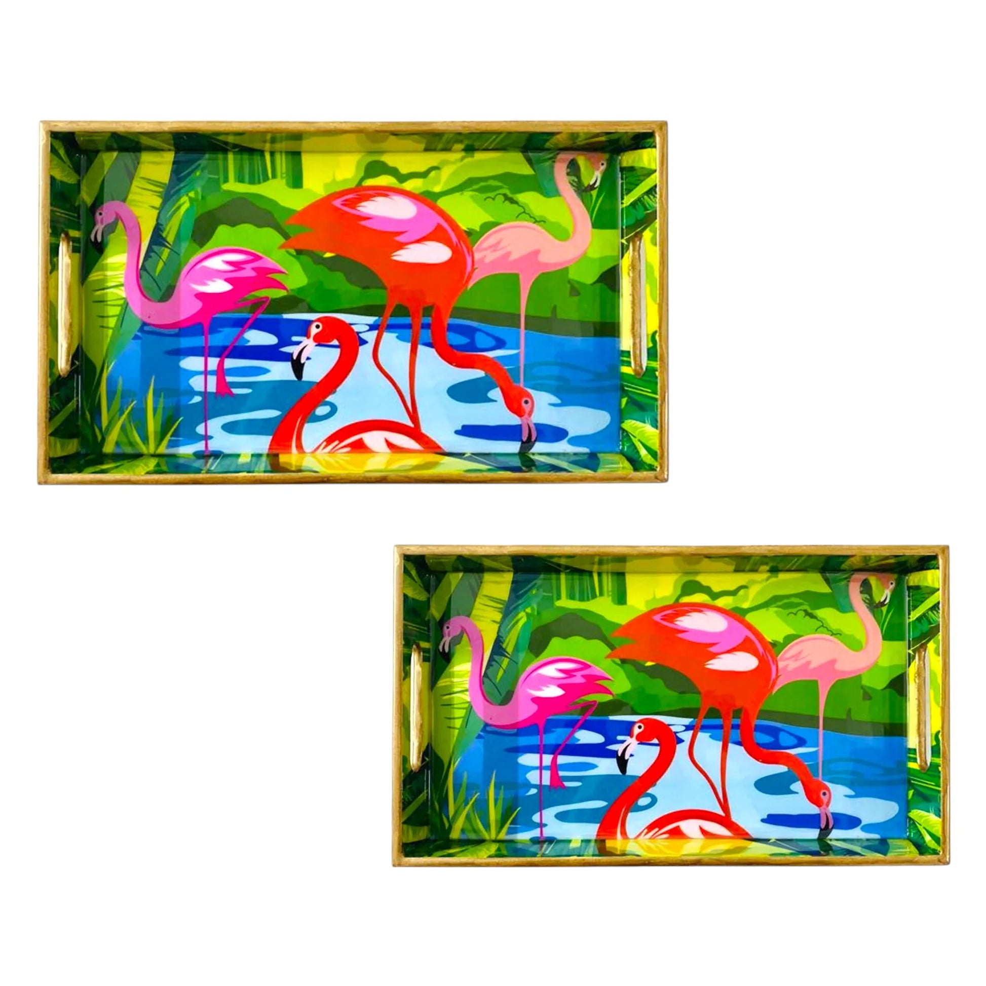 "Flamingo Elegance" Artistic Wooden Cutlery-Rectangular Tray- Set of 2 I Serve ware I Hand Crafted I Decorative I Gift I Size-12*6*2 & 14*8*2 Inch