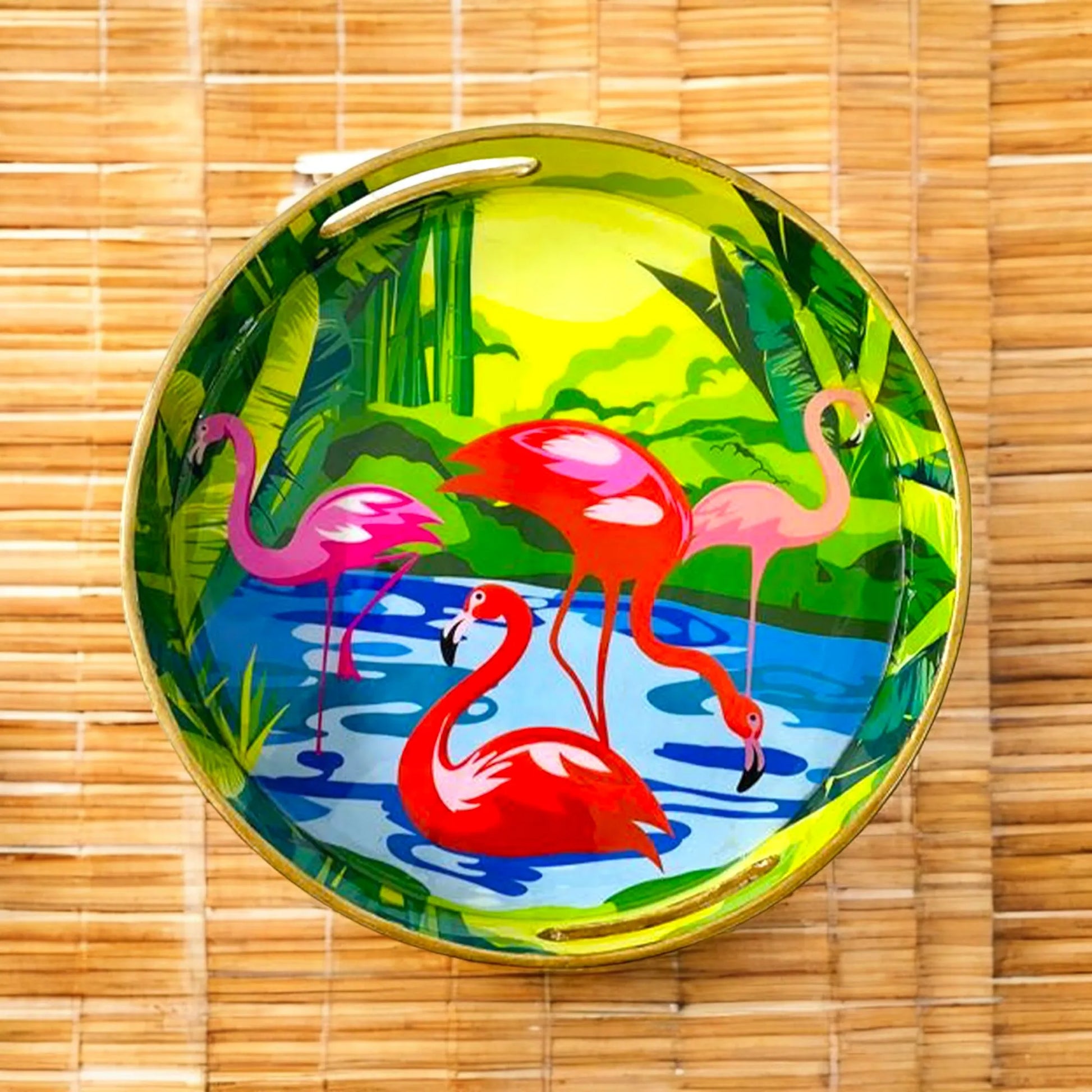 "Flamingo Elegance" Artistic Wooden Cutlery-Round Tray Small I Serve ware I Hand Crafted I Decorative I Meena Print I Gift Item I Size-10*10*2 Inch