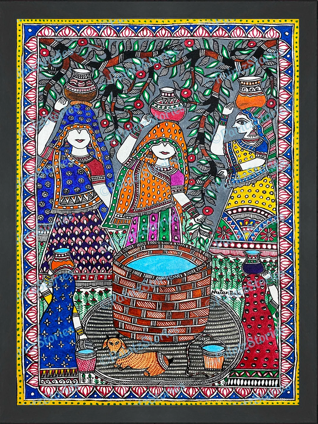 This lovely piece of painting was created by Ms. Nutan Bala, a well-known artist from Madhubani, Bihar, and a state awardee. Through her painting, she has raised a critical subject of water protection in the Mithila region.