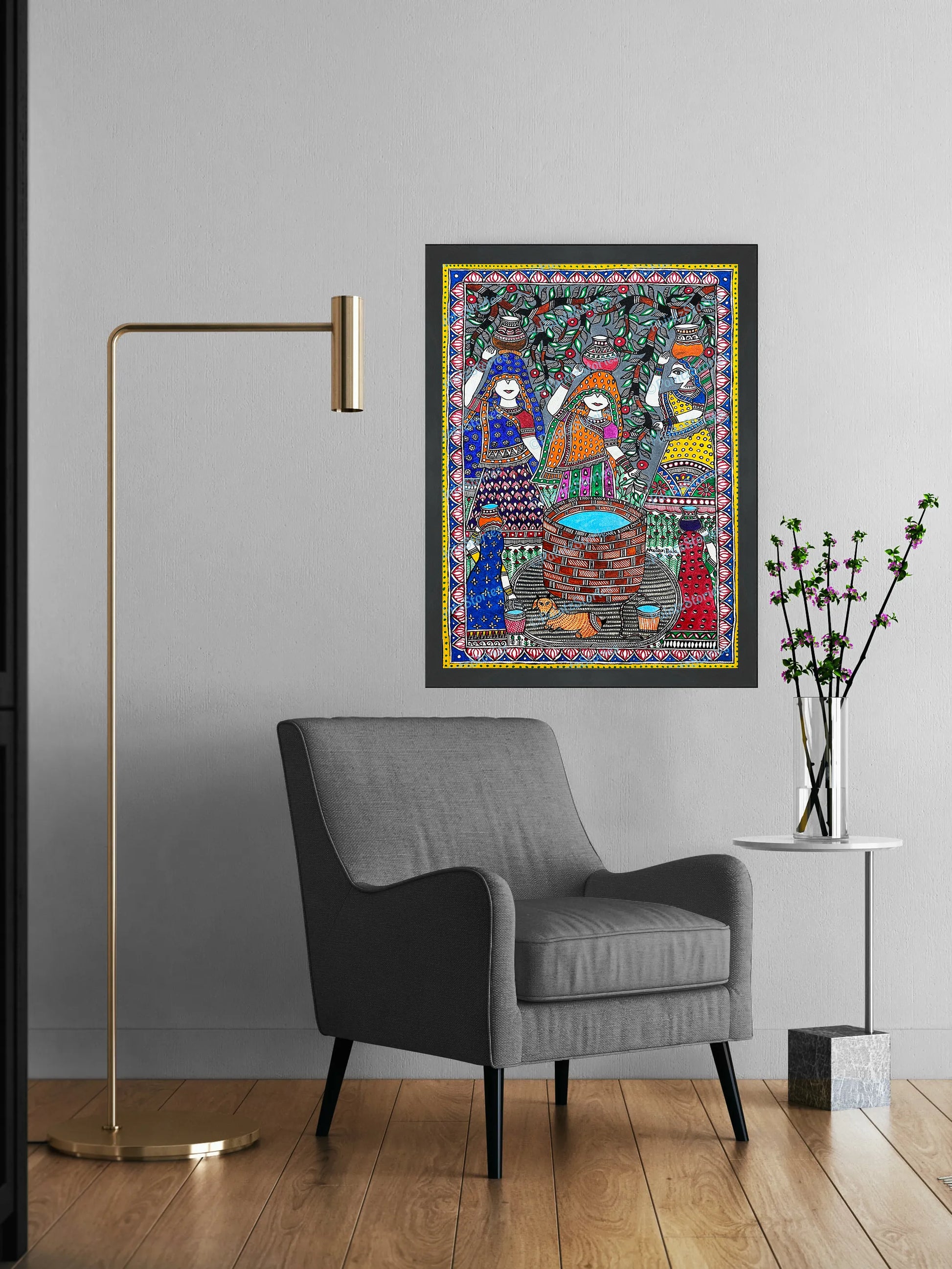 In this artwork, the artist has masterfully portrayed the complete story. Many women have gathered at the well to fill the pot. A goat is also spotted approaching the well to drink.