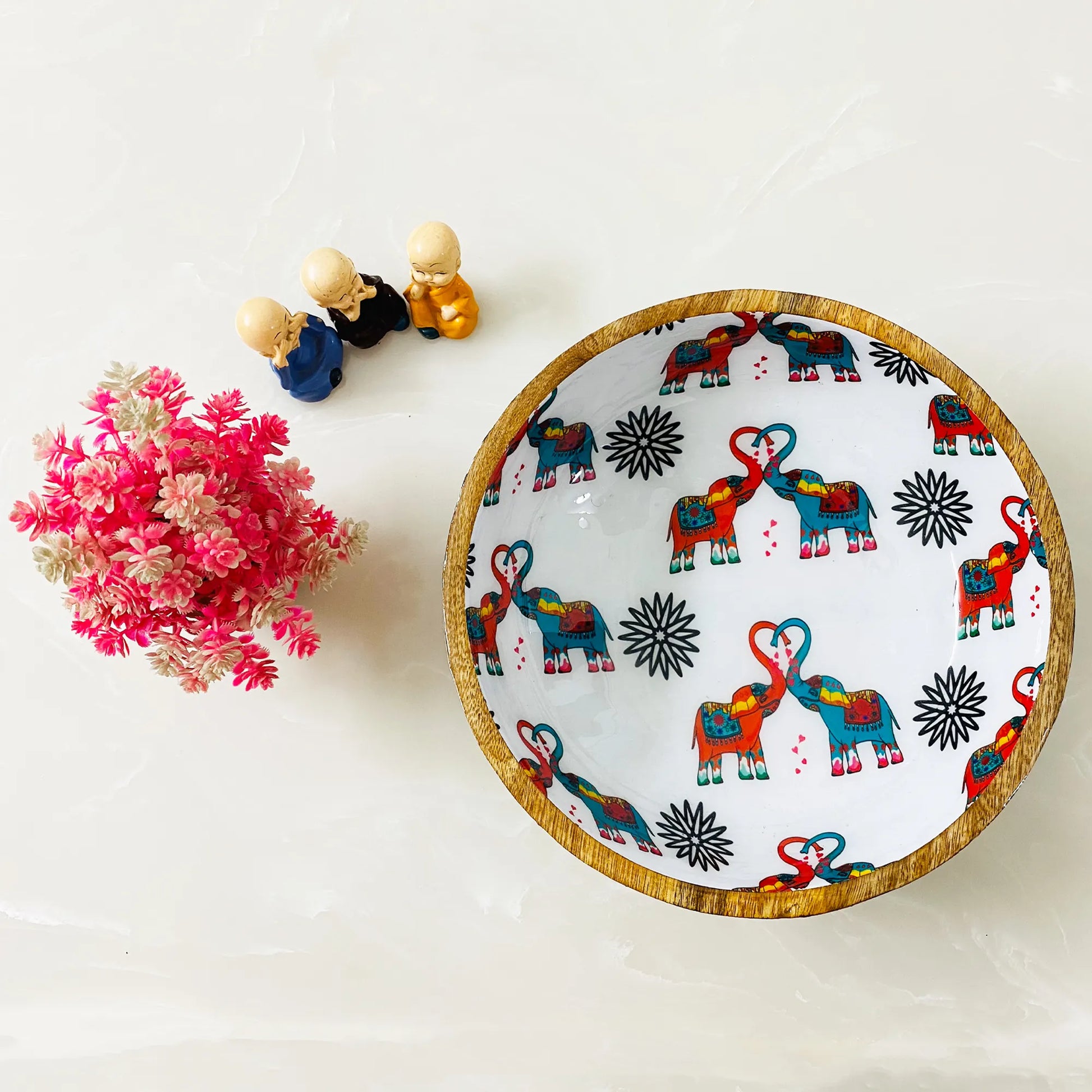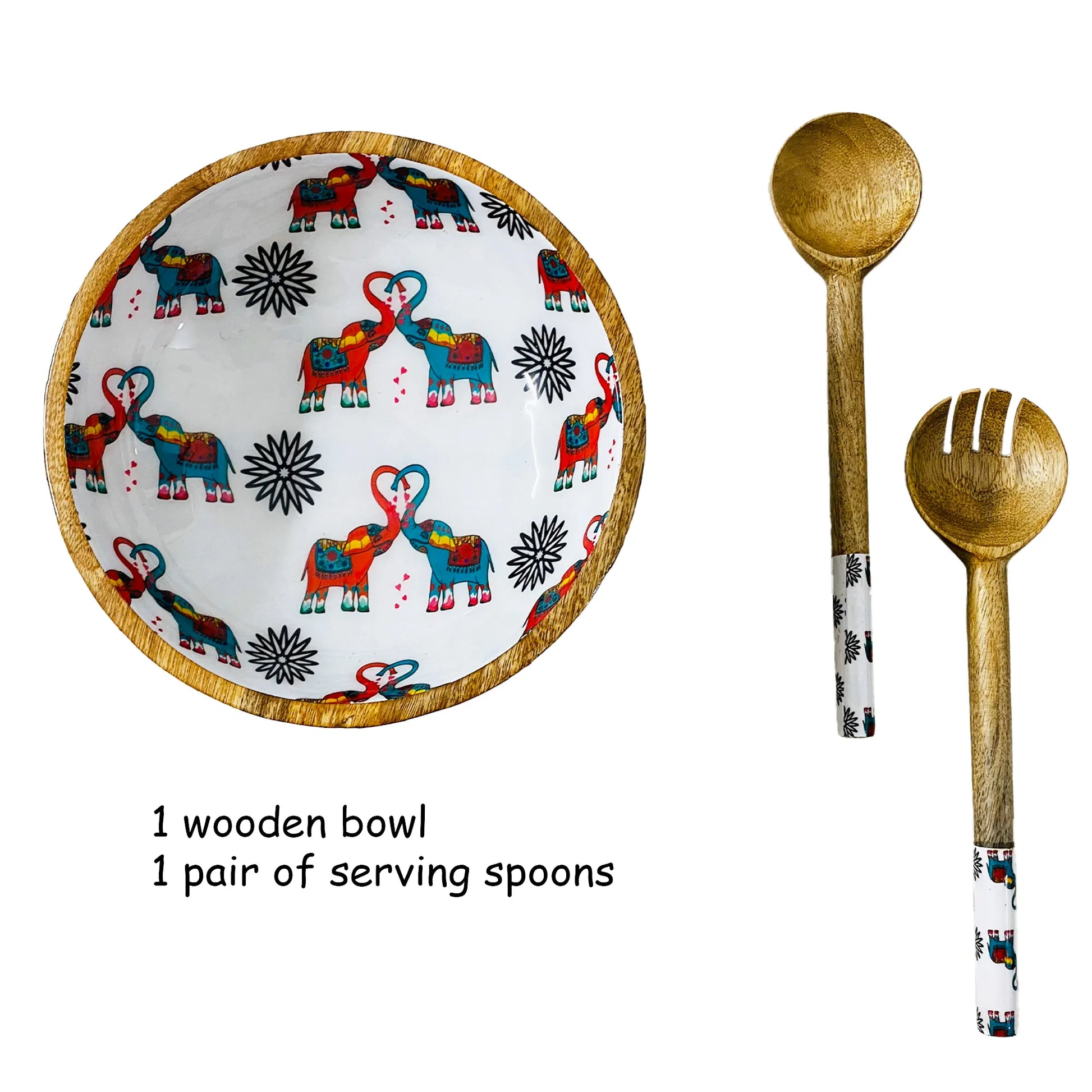 "Elephants In Love" Artistic Wooden Cutlery-Big Bowl with Serving Spoons I Dine ware I Hand Crafted I Decorative I Meena Print I Size-10*10*3 Inch