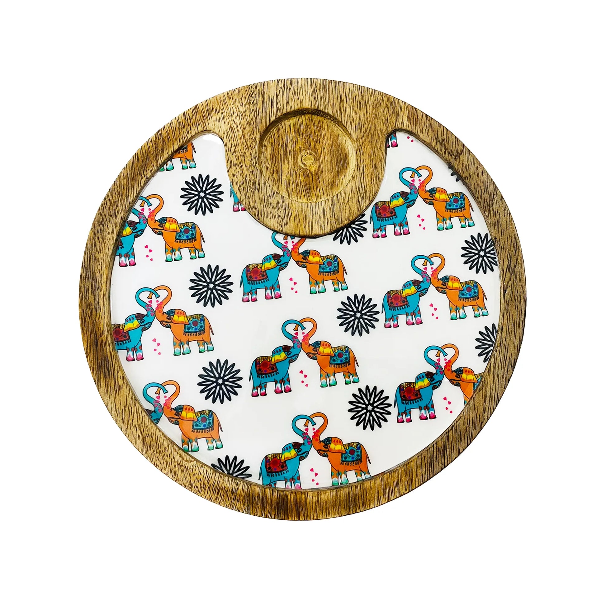 "Elephants In Love" Artistic Wooden Cutlery-Circular Platter with Wooden Bowl I Table ware I Hand Crafted I Decorative I Meena Print I Size-10*10 Inch