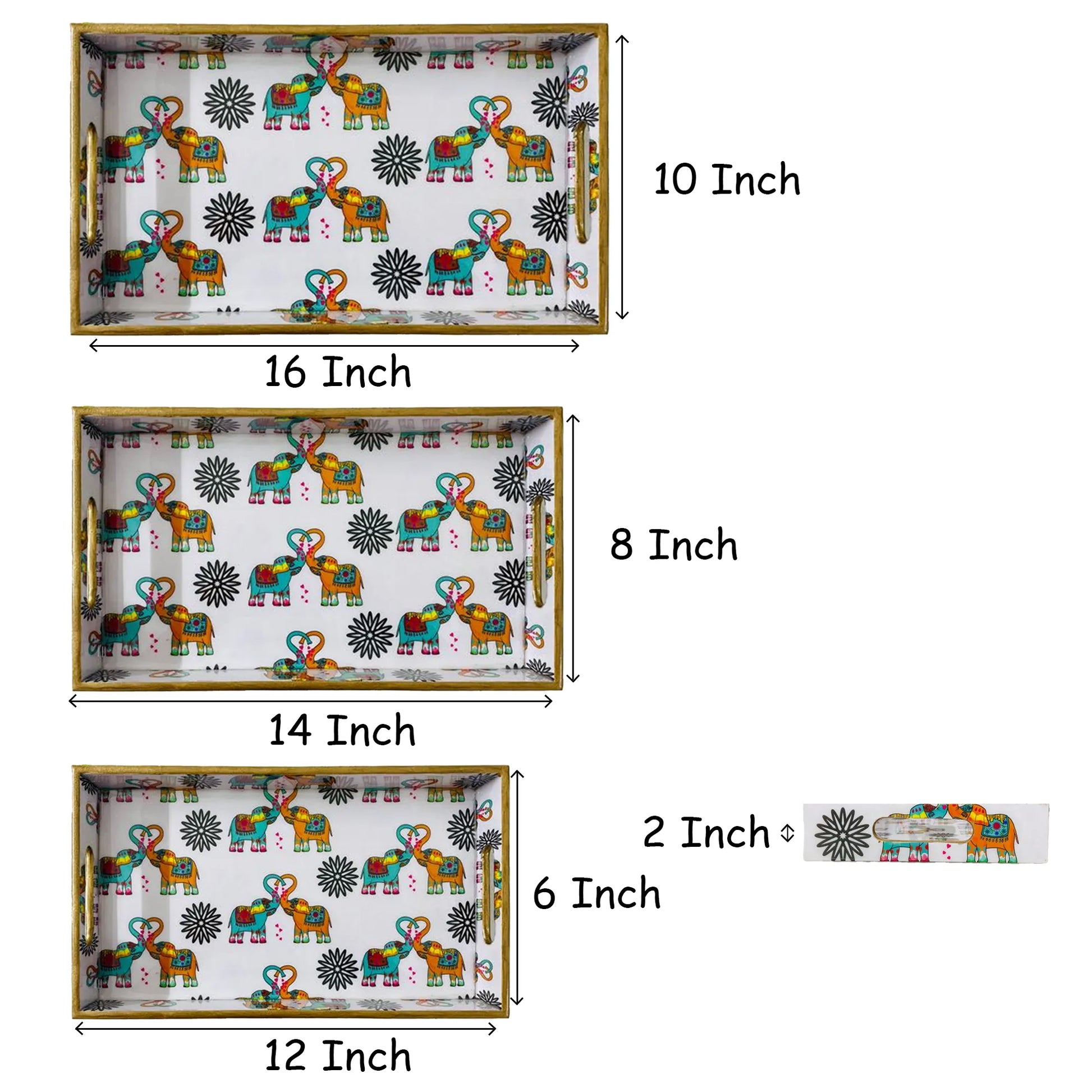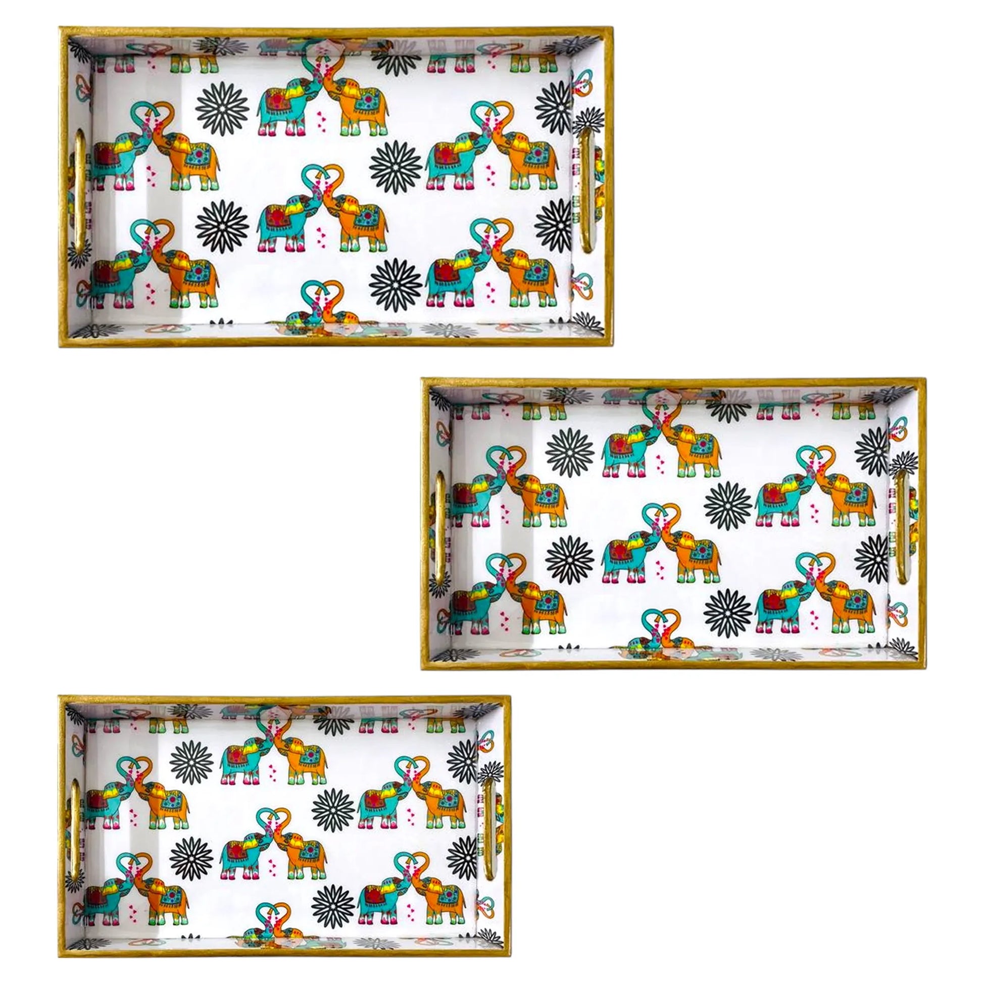 "Elephants In Love" Artistic Wooden Cutlery-Rectangular Trays (Set of 3) I Serve ware I Handmade I Meena Print I Size-12*6*2,14*8*2 & 16*10*2 Inch