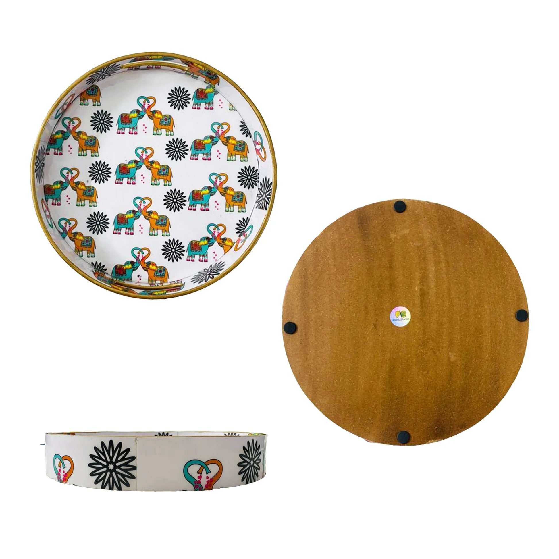 "Elephants In Love" Artistic Wooden Cutlery-Round Tray Large I Serve ware I Hand Crafted I Decorative I Meena Print I Gift Item I Size-12*12*2 Inch