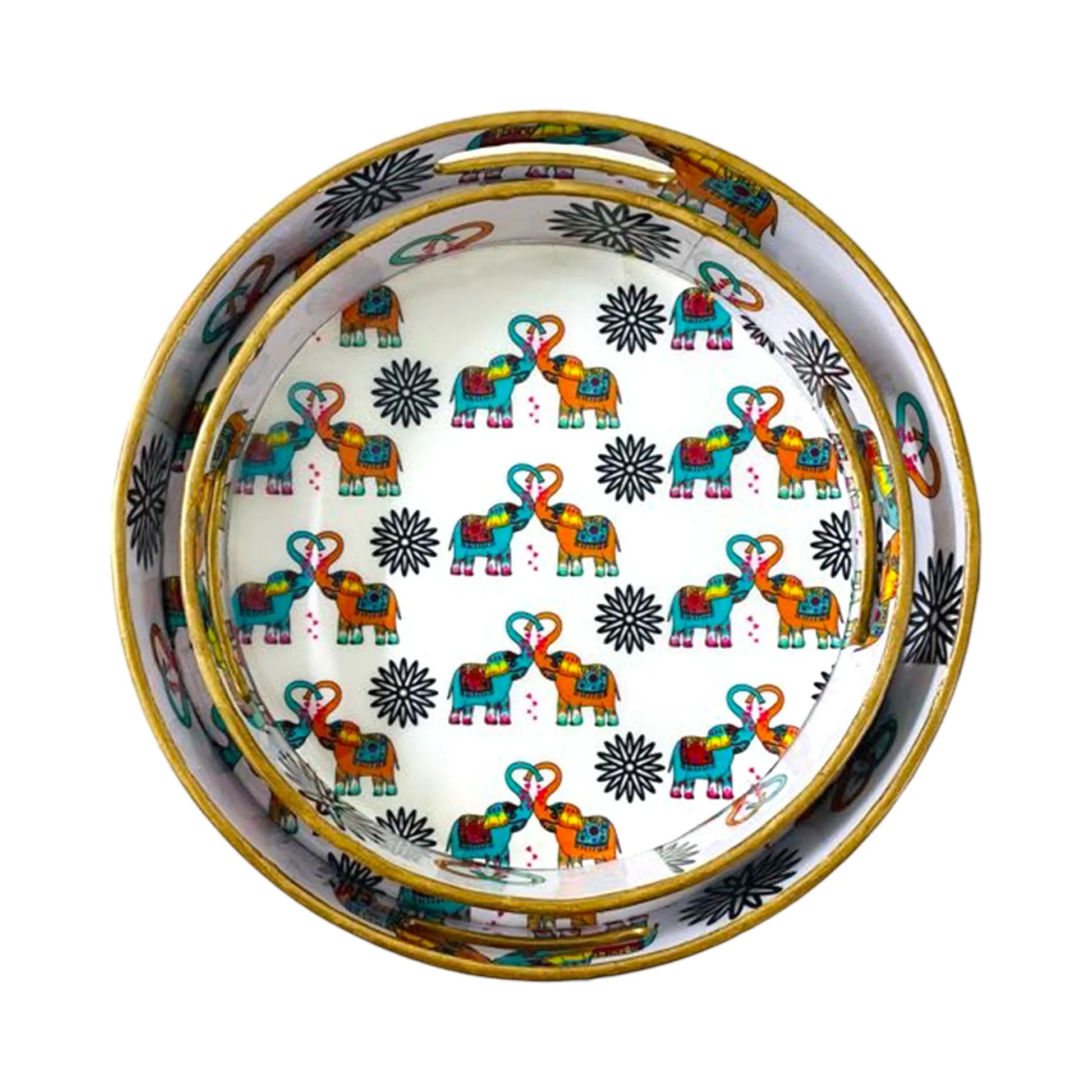 "Elephants In Love" Artistic Wooden Cutlery-Round Trays (Set of 2) I Serve ware I Handmade I Decorative I Meena Print I Size-10*10*2 & 12*12*2 Inch