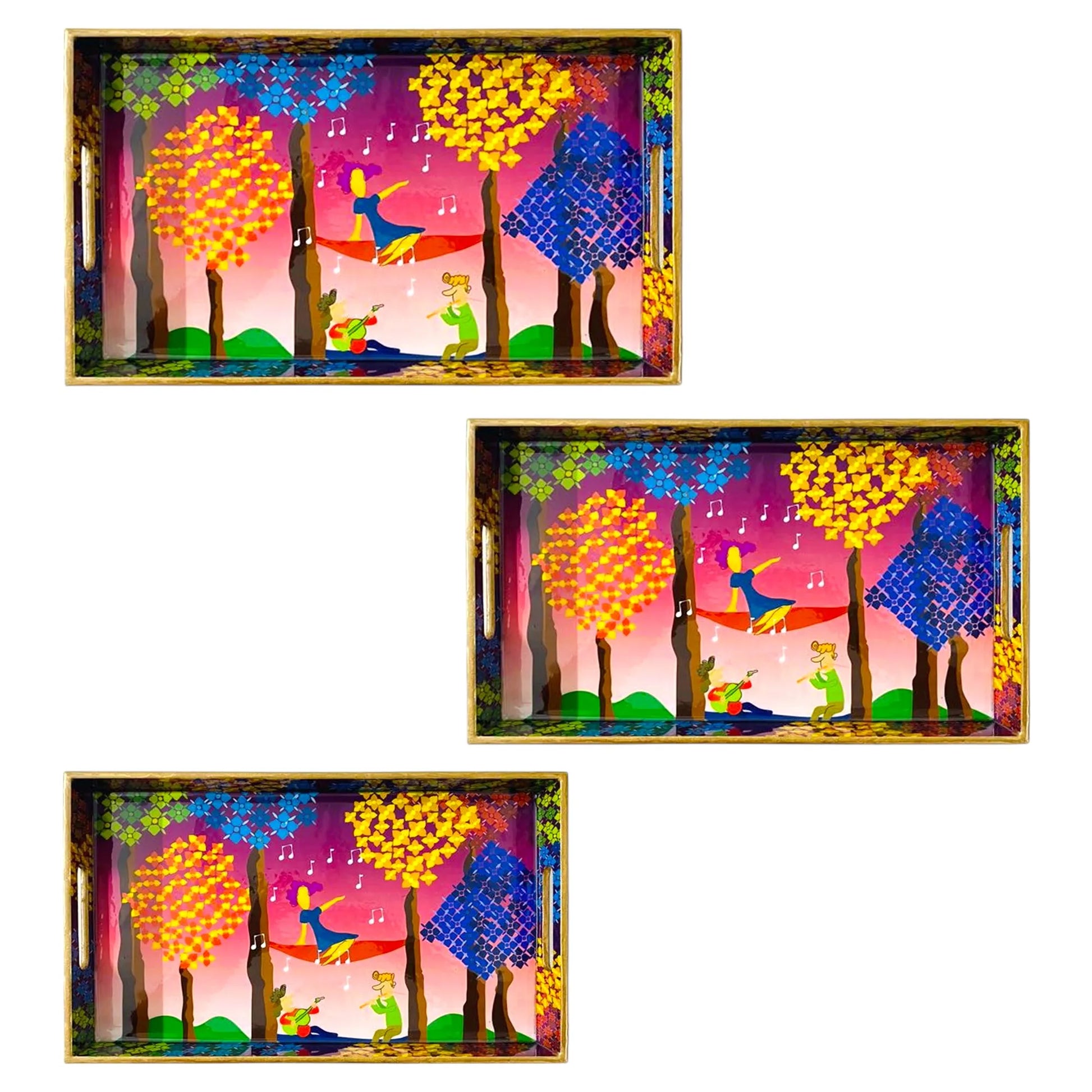 "Tree Serenade" Artistic Wooden Cutlery-Rectangular Trays (Set of 3) I Serve ware I Handmade I Decorative I Meena I Size-12*6*2,14*8*2 & 16*10*2 Inch