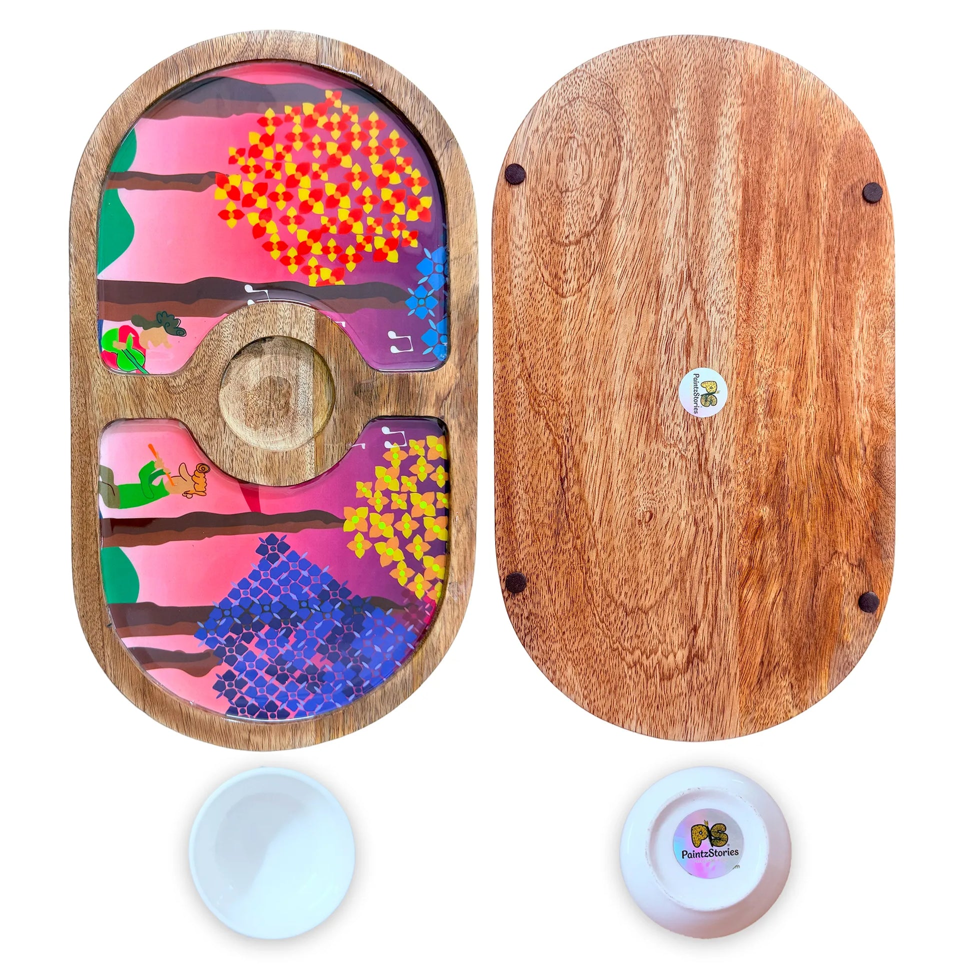 "Tree Serenade" Artistic Wooden Cutlery-Round Platter with Ceramic Bowl I Dine ware I Hand Crafted I Living Room Décor I Meena Print I Size-14*8 Inch