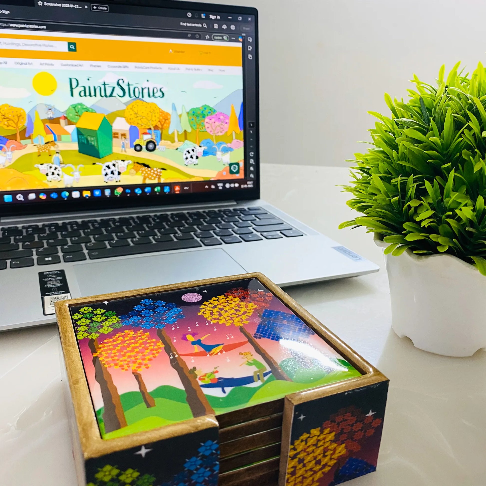 3.Items included : Set of 6 Wooden Coasters with holder ( 4*4 Inch), PaintzStories' Card, Paintz Welcome Letter