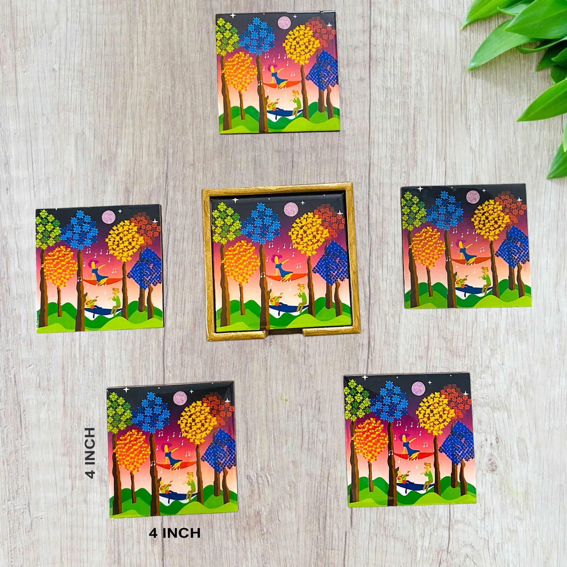 "Tree Serenade" Artistic Wooden Cutlery-Wooden Tea Coaster I Table ware I Hand Crafted I Living Room Décor I Decorative I Meena Print I Size- 4*4 Inch