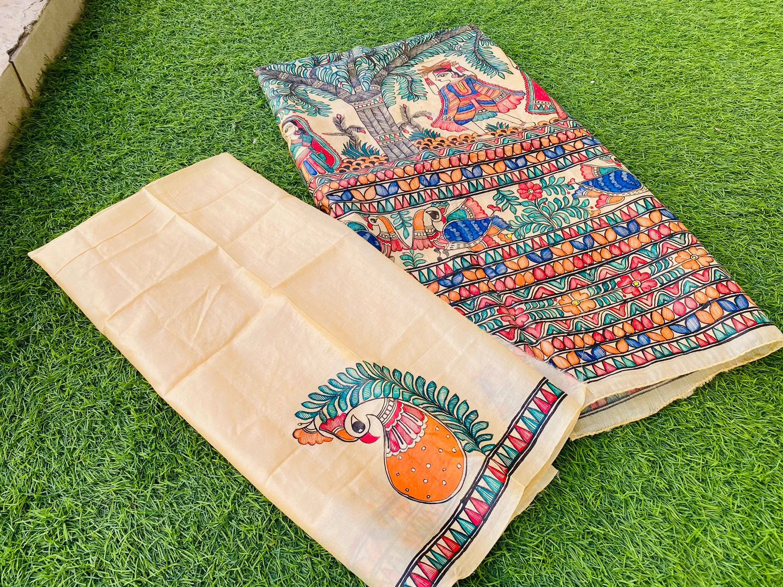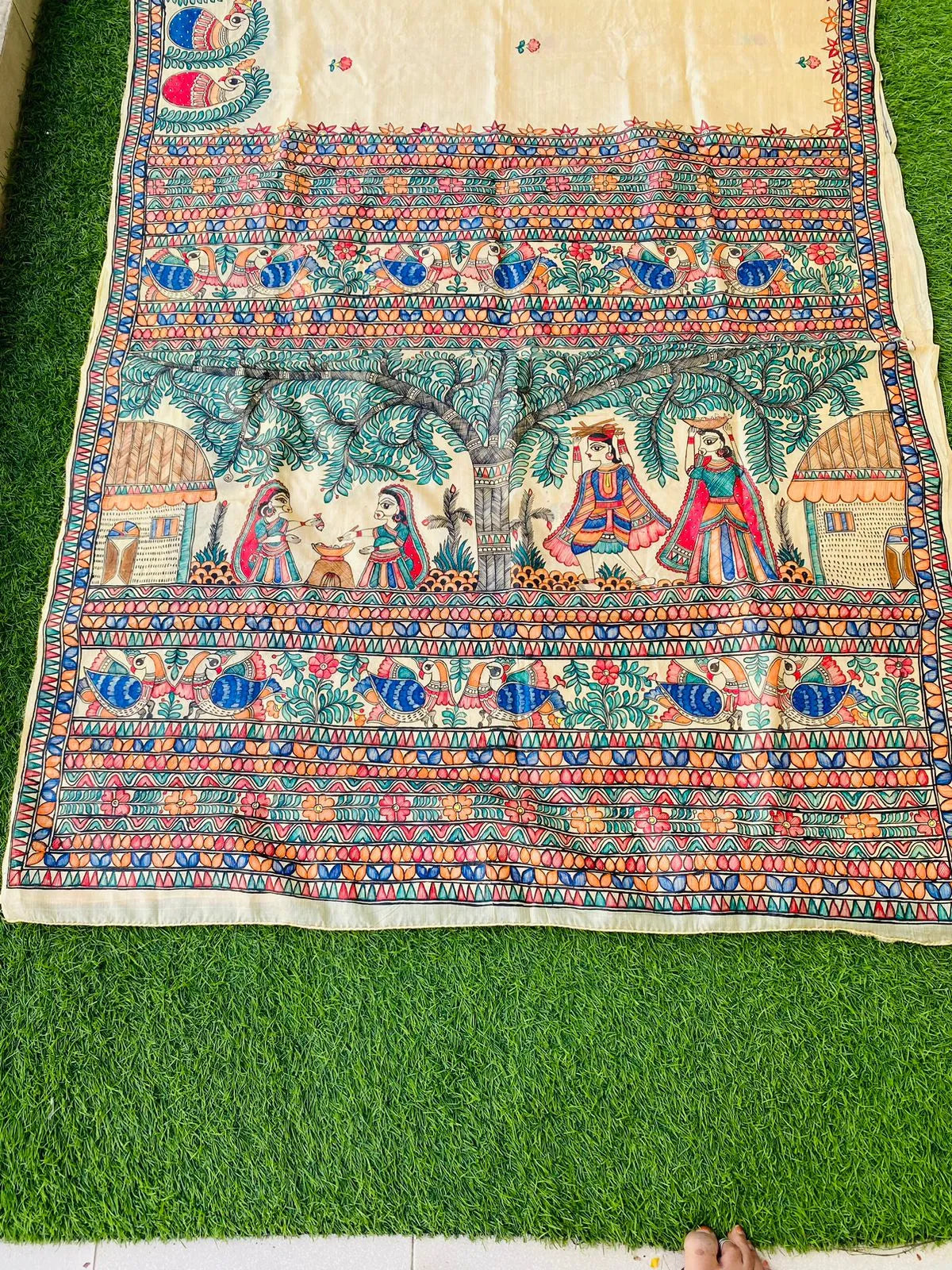 "Madhubani Handpainted Artistic Saree-Rural household theme"