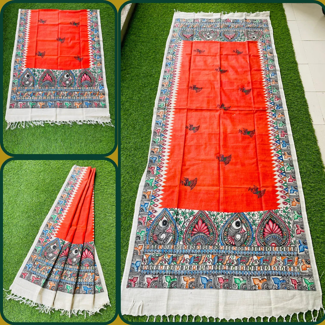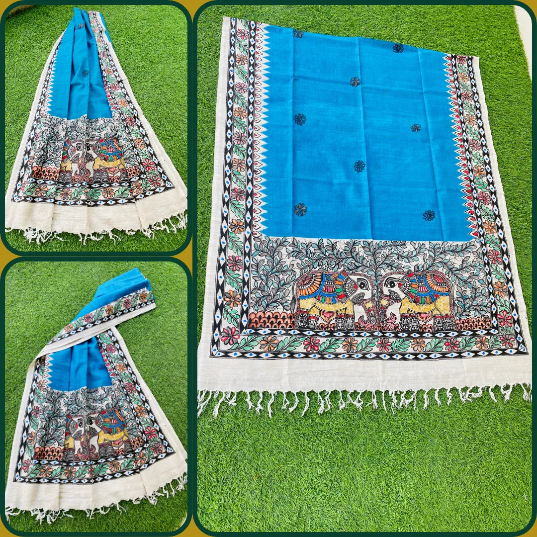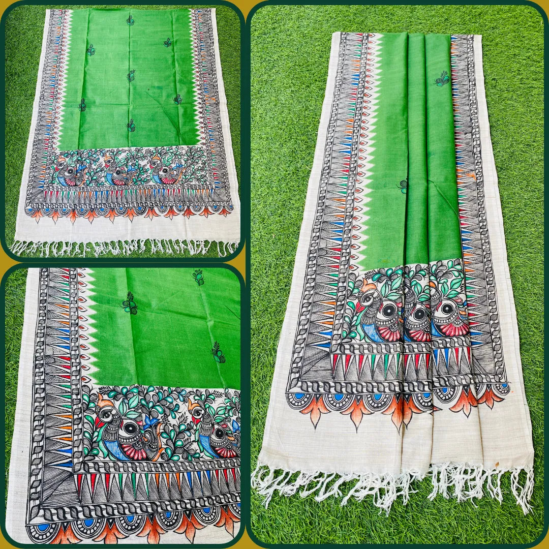 Embrace the timeless elegance of tradition while uplifting rural artists with a Madhubani hand-painted dupatta. Each dupatta is a handcrafted masterpiece, meticulously adorned with intricate designs that draw inspiration from nature, mythology, and folklore. By selecting this unique garment, you're not only enhancing your wardrobe with its exquisite charm, but also empowering talented artisans and helping to tell their stories. Crafted with vibrant colors and bold detailing, every dupatta celebrates the beauty of Madhubani art, offering you a meaningful way to support the rich heritage of rural craftsmanship.This stunning dupatta has been carefully hand-painted by our esteemed artist, Ms. Seema Nishant, who belongs from Madhubani district.