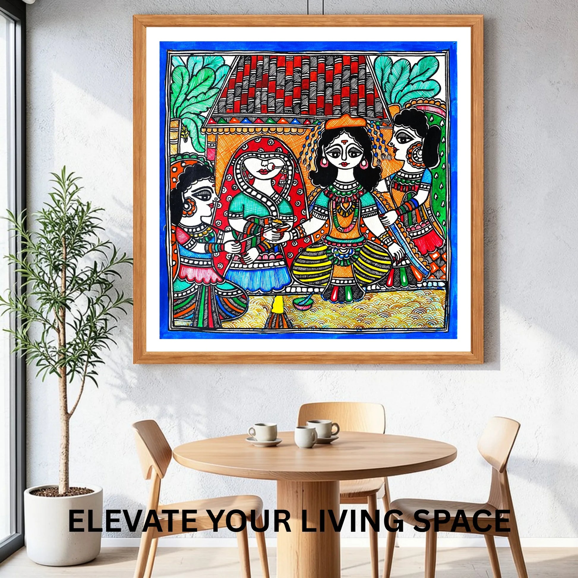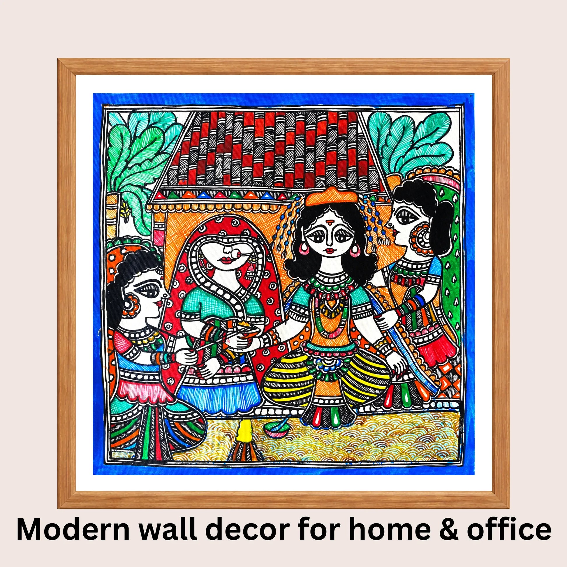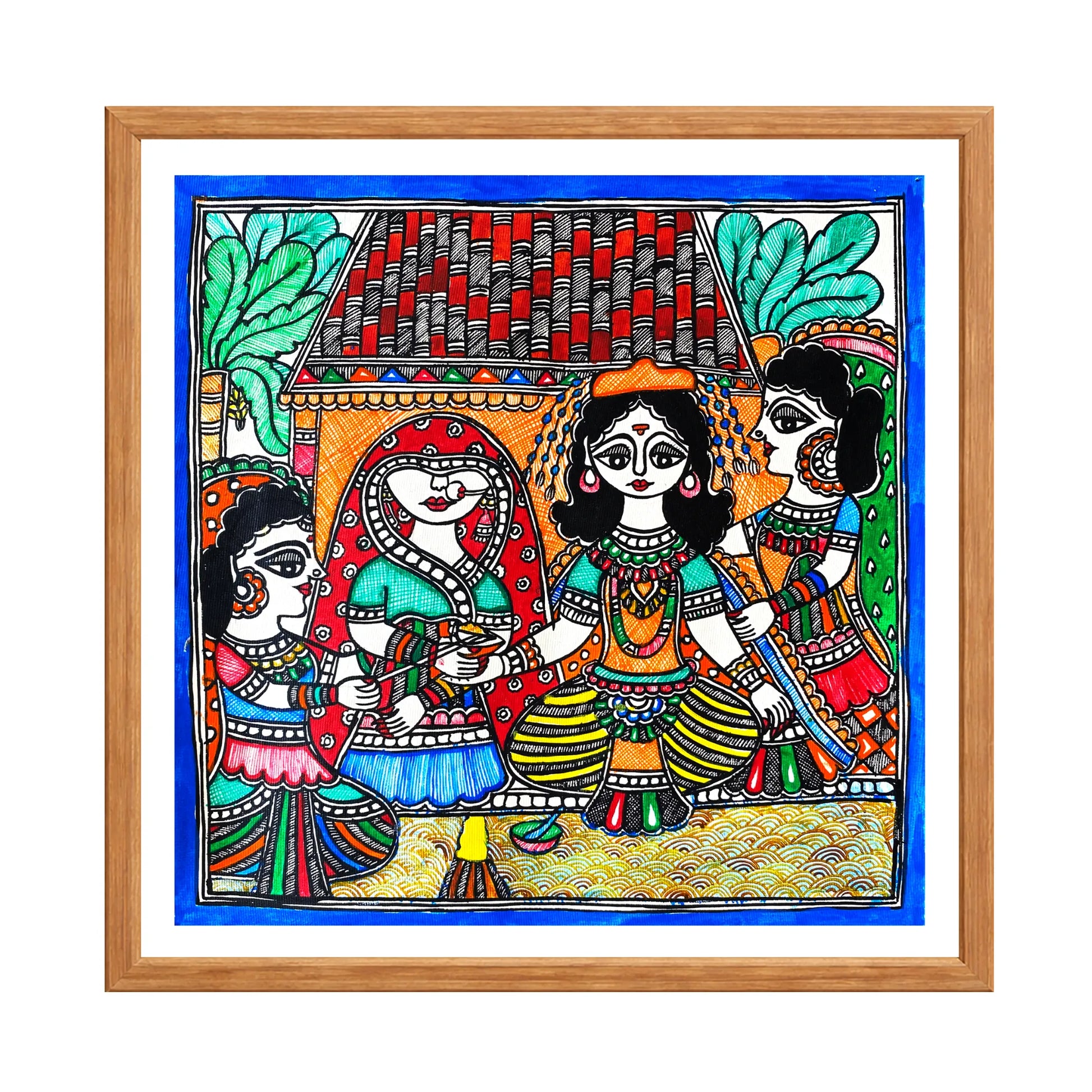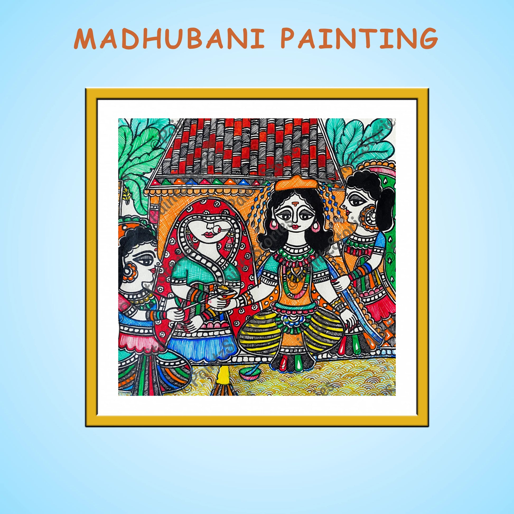 Marriage in the Mithila region is deeply rooted in tradition and culture, with unique customs tied to its rich heritage and the Ramayana. Ms. Seema Nishant, a well known artist from Madhubani, Bihar has beautifully portrays these rituals through Madhubani paintings on a handmade paper.