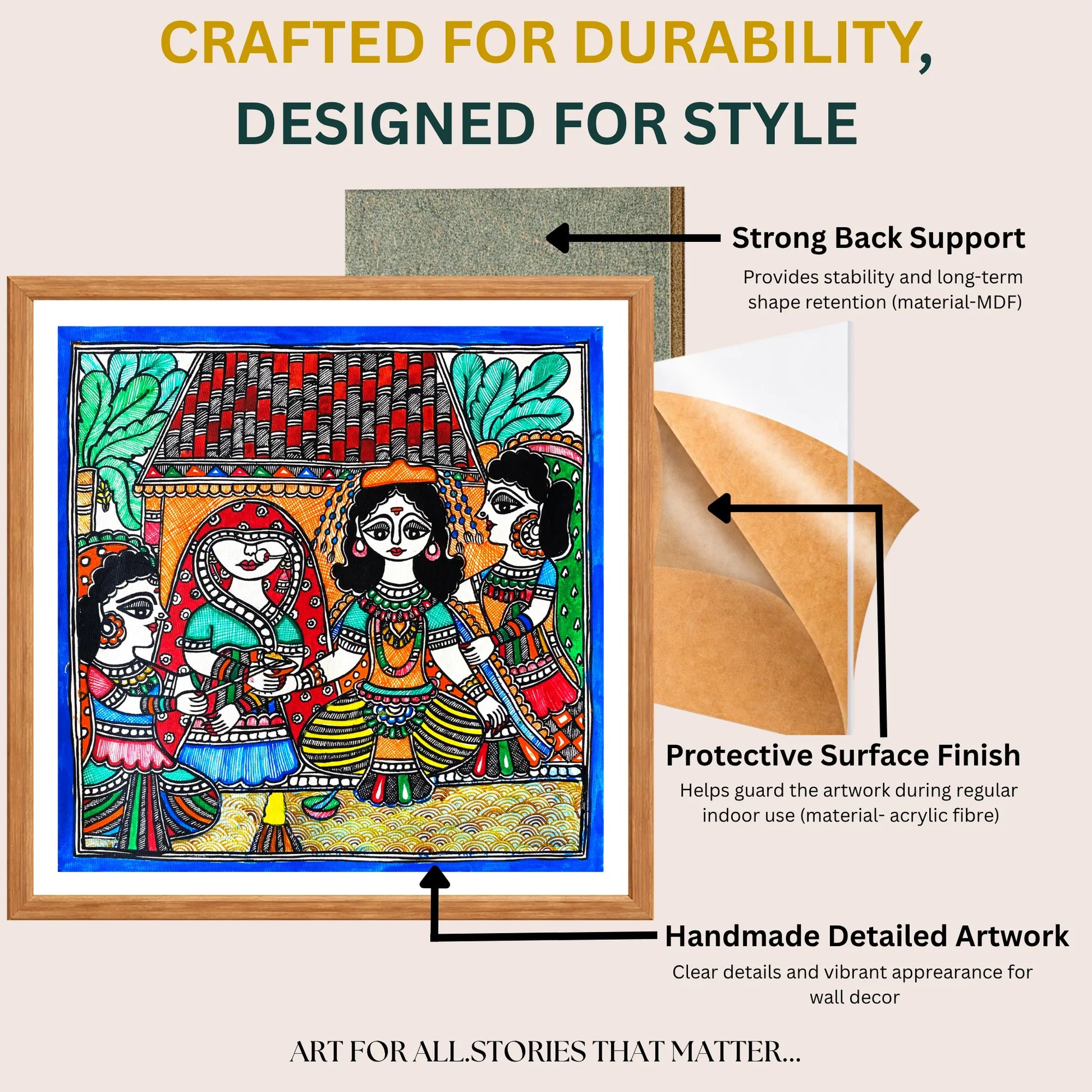 "Immerse yourself in the vibrant tradition of Madhubani painting (also called Mithila painting), where every brushstroke narrates a tale. Our authentic Madhubani artworks epitomize India's cultural richness with intricate designs, vivid hues, and meaningful symbols. Crafted by skilled artisans, each piece is a handmade masterpiece, offering a distinctive touch to your bedroom decor, living room decor, or wall decor, and honouring the artistic heritage of our nation."