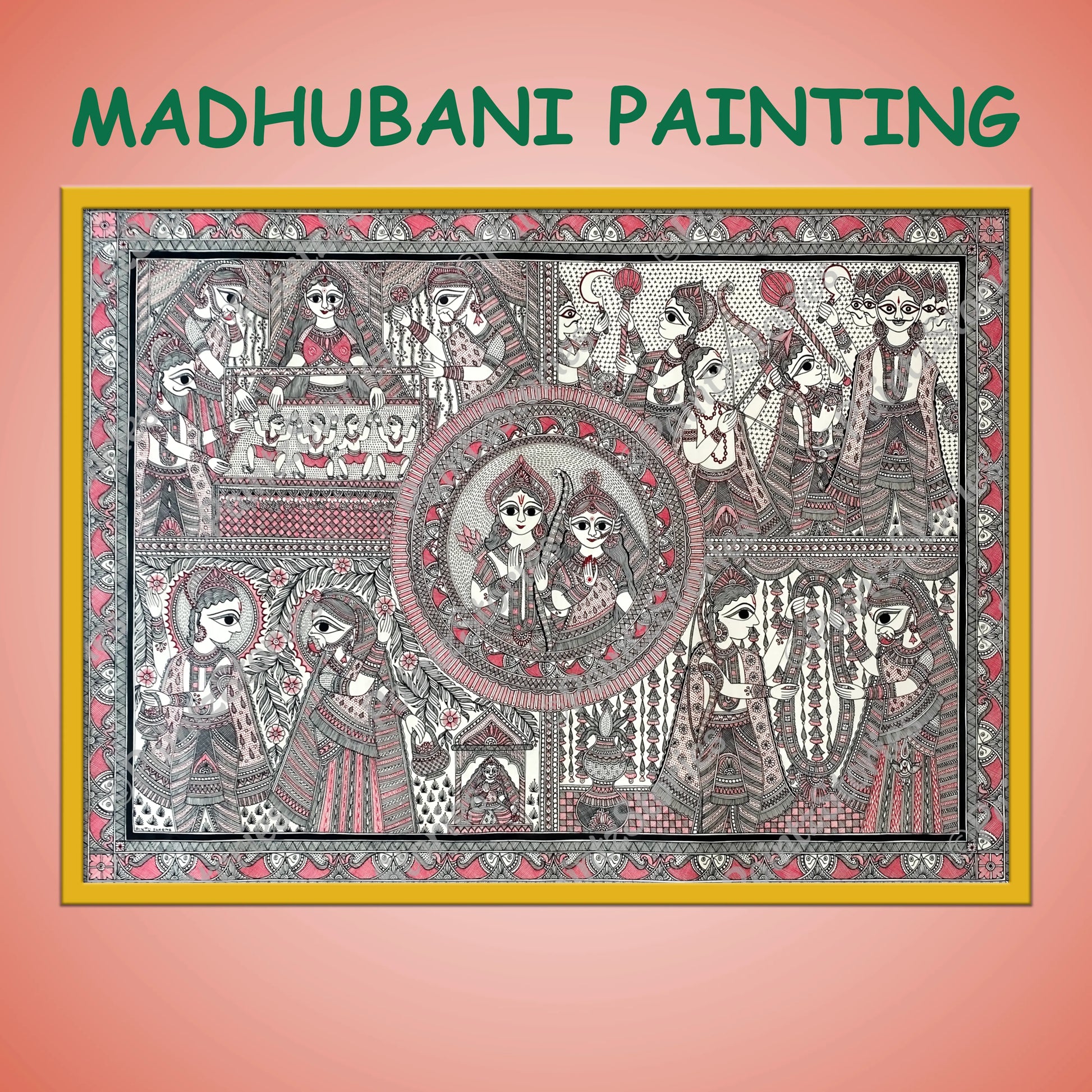 Artist Mr. Pintu’s Madhubani painting vividly captures various stages of the Ramayana, depicted in an anti-clockwise direction from the top left, with Lord Rama and Sita at the centre.