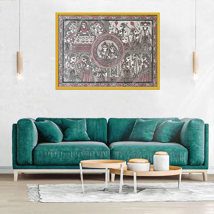 "Immerse yourself in the vibrant tradition of Madhubani painting (also called Mithila painting), where every brushstroke narrates a tale. Our authentic Madhubani artworks epitomize India's cultural richness with intricate designs, vivid hues, and meaningful symbols. Crafted by skilled artisans, each piece is a handmade masterpiece, offering a distinctive touch to your bedroom decor, living room decor, or wall decor, and honouring the artistic heritage of our nation."