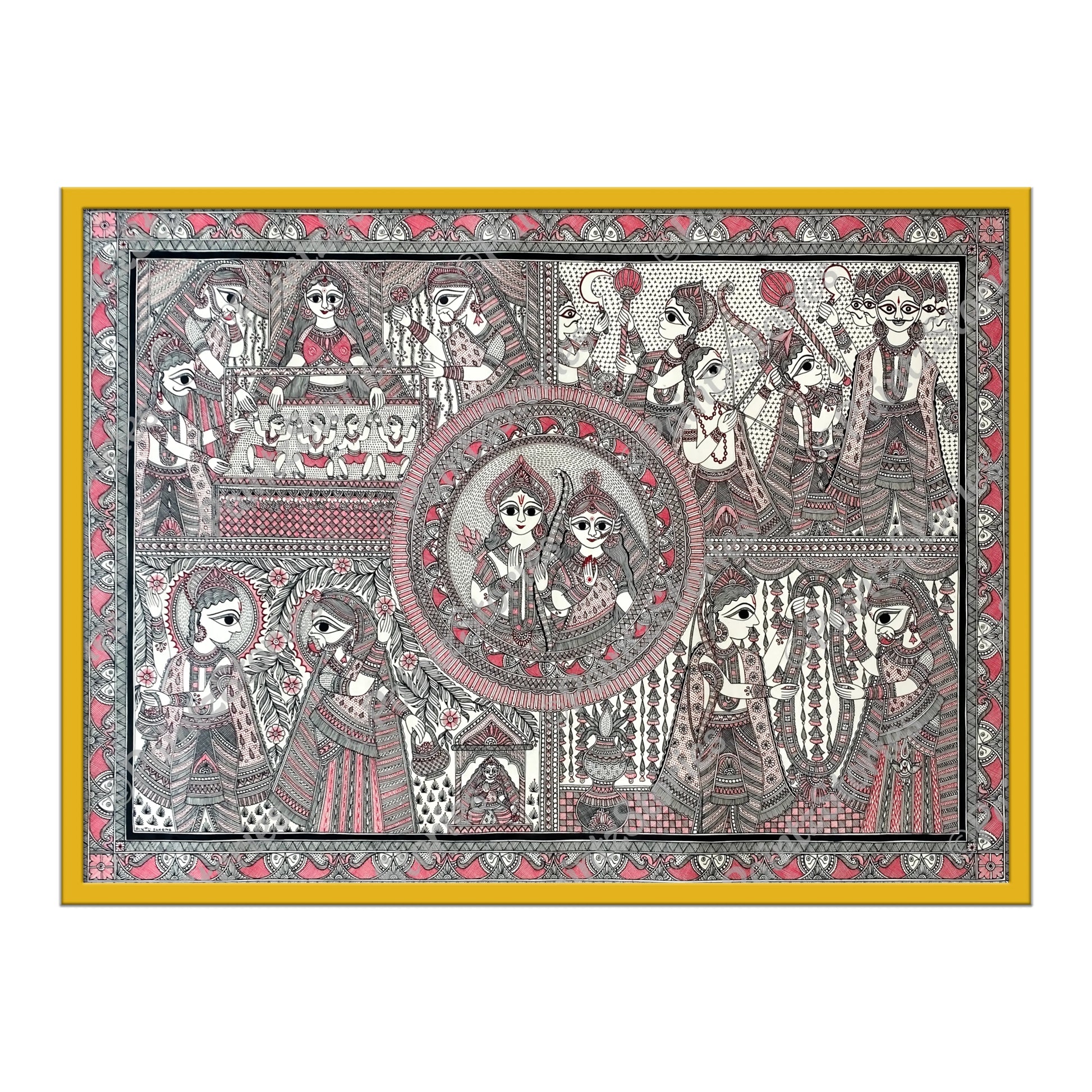 Mithila painting artist Mr. Pintu Sharma, renowned for his exceptional skill, has created a captivating masterpiece on handmade paper. In this mesmerizing work, he beautifully captures the essence of the Ramayana, depicting its various stages with remarkable artistry and detail.