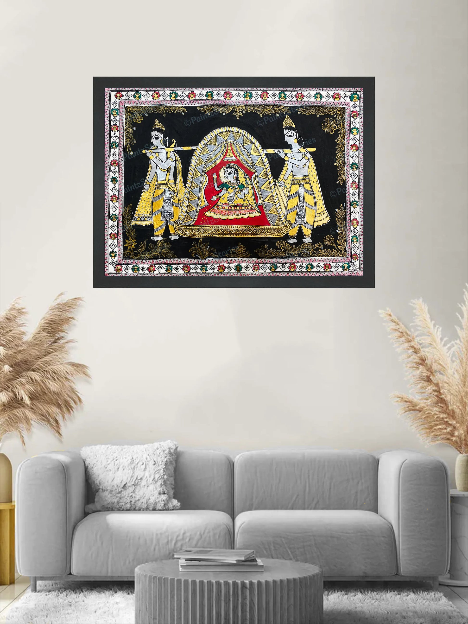 Ms. Asha Das, a Madhubani native, created this beautiful Madhubani artwork in which Lord Sri Ram and Sri Krishna are carrying goddess Lakshmi and goddess Saraswati in a Doli, which is a wooden frame used to transfer newlyweds to their in-laws. The male deities are referred to as "Kahar."