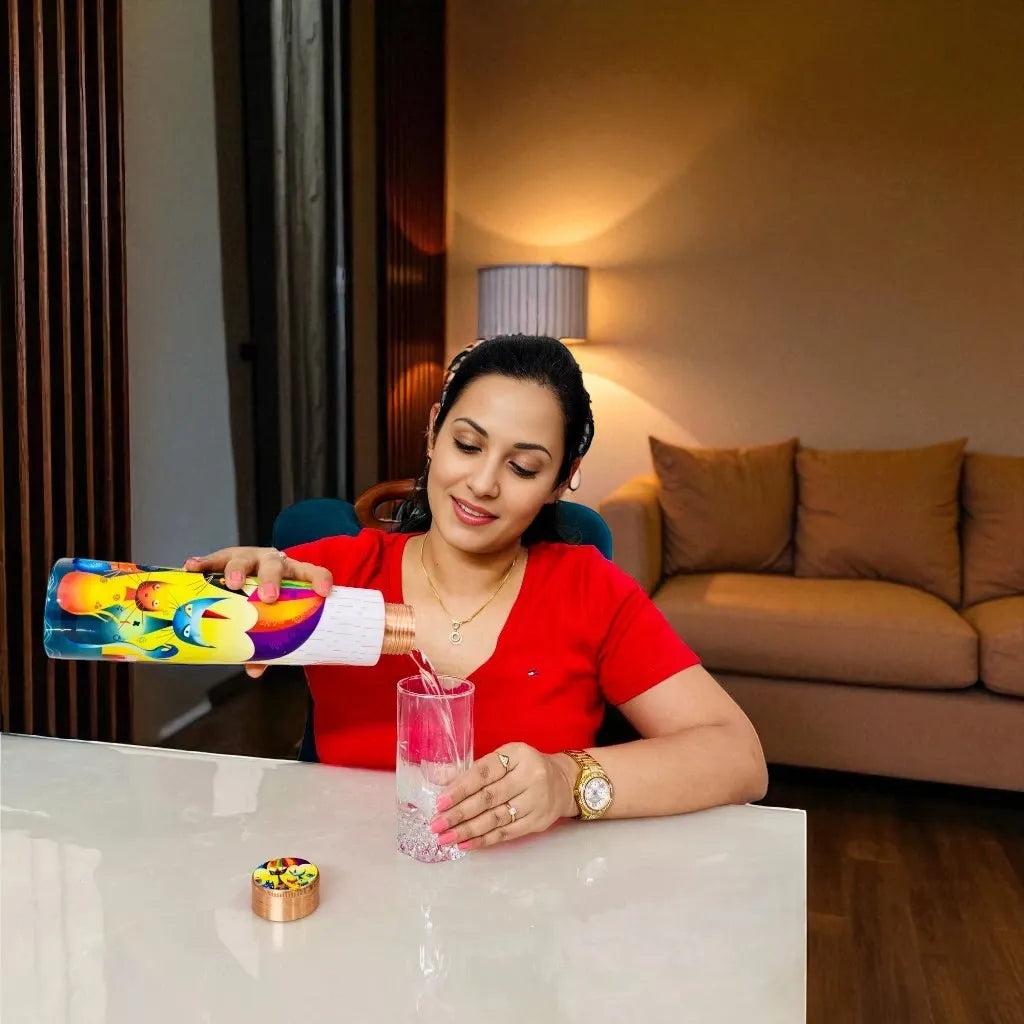 "Discover PaintzStories’ Artistic Copper Bottle, a handcrafted masterpiece that blends functionality with artistry. Featuring vibrant Meena print designs by global artists, this premium copper water bottle celebrates inclusivity and art for all. More than just drinkware, it doubles as elegant home décor, a stylish office accessory, and a perfect companion for travel and gifting. Crafted from premium copper, it promotes wellness with natural health benefits like boosting immunity, aiding digestion, and providing antibacterial properties. Lightweight, durable, and beautifully designed, this artistic copper bottle makes every sip meaningful while supporting creativity, craftsmanship, and global stories that matter."