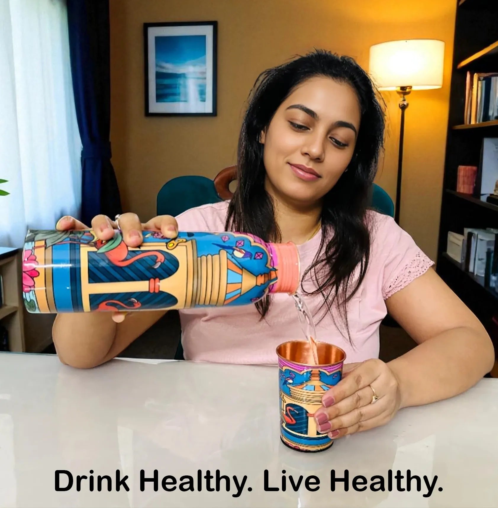 "Discover PaintzStories’ Artistic Copper Bottle, a handcrafted masterpiece that blends functionality with artistry. Featuring vibrant Meena print designs by global artists, this premium copper water bottle celebrates inclusivity and art for all. More than just drinkware, it doubles as elegant home décor, a stylish office accessory, and a perfect companion for travel and gifting. Crafted from premium copper, it promotes wellness with natural health benefits like boosting immunity, aiding digestion, and providing antibacterial properties. Lightweight, durable, and beautifully designed, this artistic copper bottle makes every sip meaningful while supporting creativity, craftsmanship, and global stories that matter."