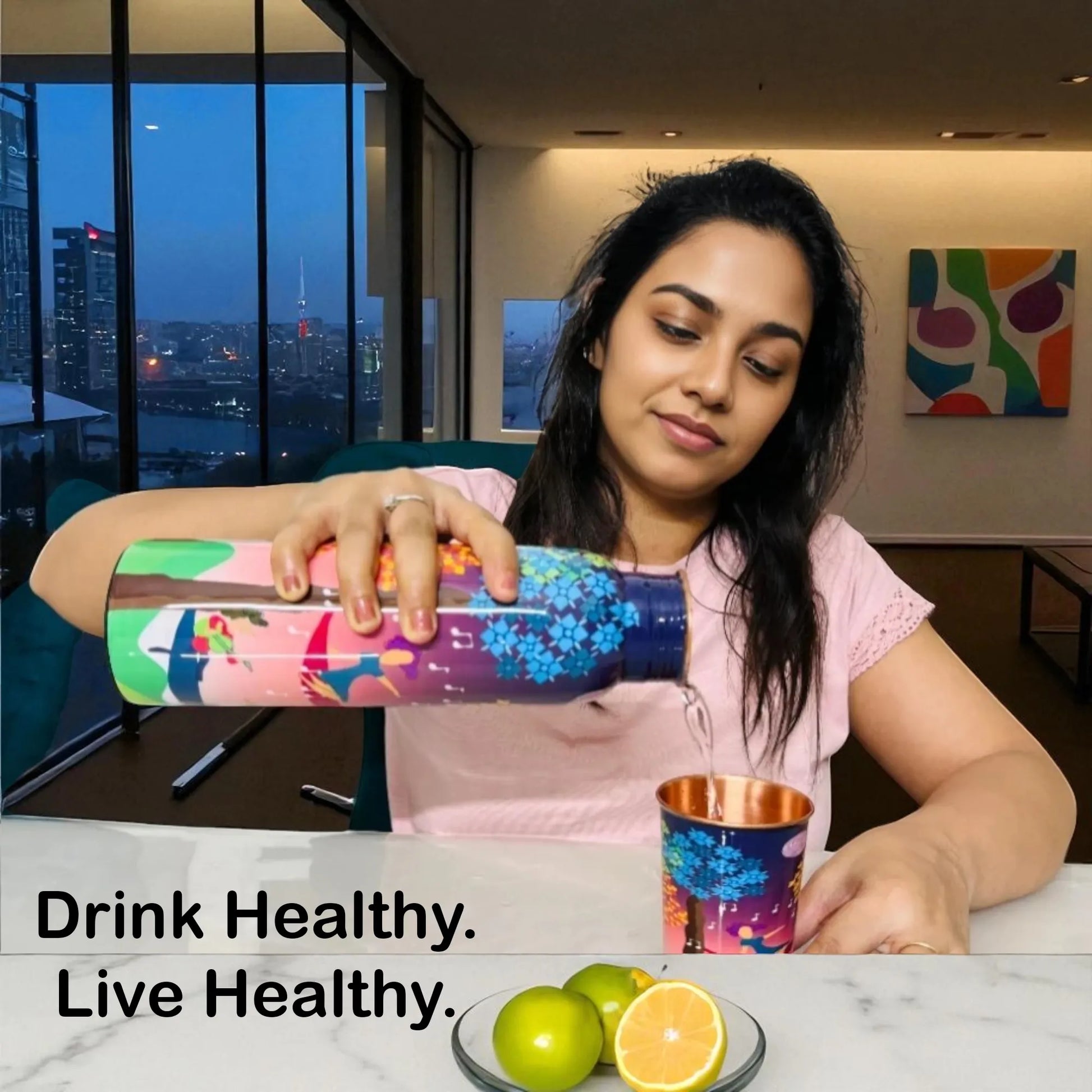 "Discover PaintzStories’ Artistic Copper Bottle, a handcrafted masterpiece that blends functionality with artistry. Featuring vibrant Meena print designs by global artists, this premium copper water bottle celebrates inclusivity and art for all. More than just drinkware, it doubles as elegant home décor, a stylish office accessory, and a perfect companion for travel and gifting. Crafted from premium copper, it promotes wellness with natural health benefits like boosting immunity, aiding digestion, and providing antibacterial properties. Lightweight, durable, and beautifully designed, this artistic copper bottle makes every sip meaningful while supporting creativity, craftsmanship, and global stories that matter."