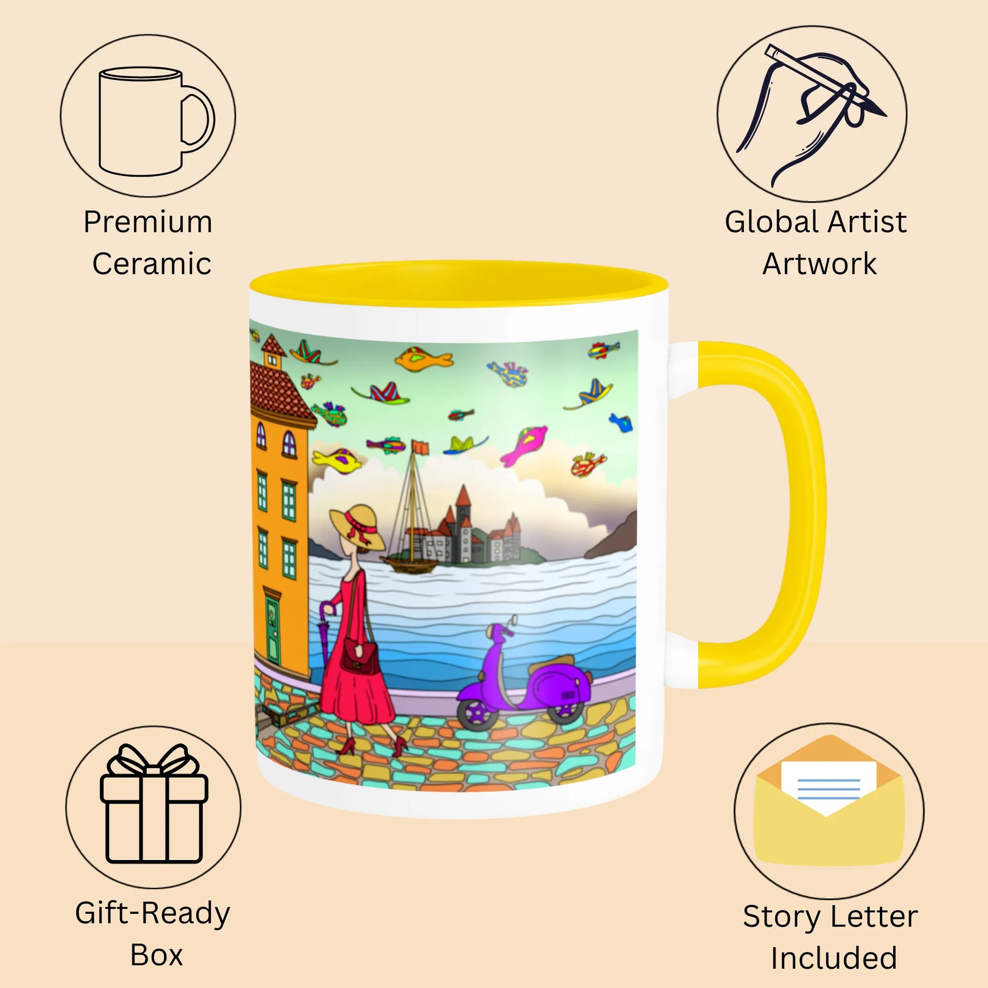 PAINTZSTORIES A Walking Lady Artistic Ceramic Coffee Mug with Digital Print by Global Artists | Durable Ceramic Cup for Coffee, Tea & Cold Beverages | Printed Mug for Birthday Gift | 350ml