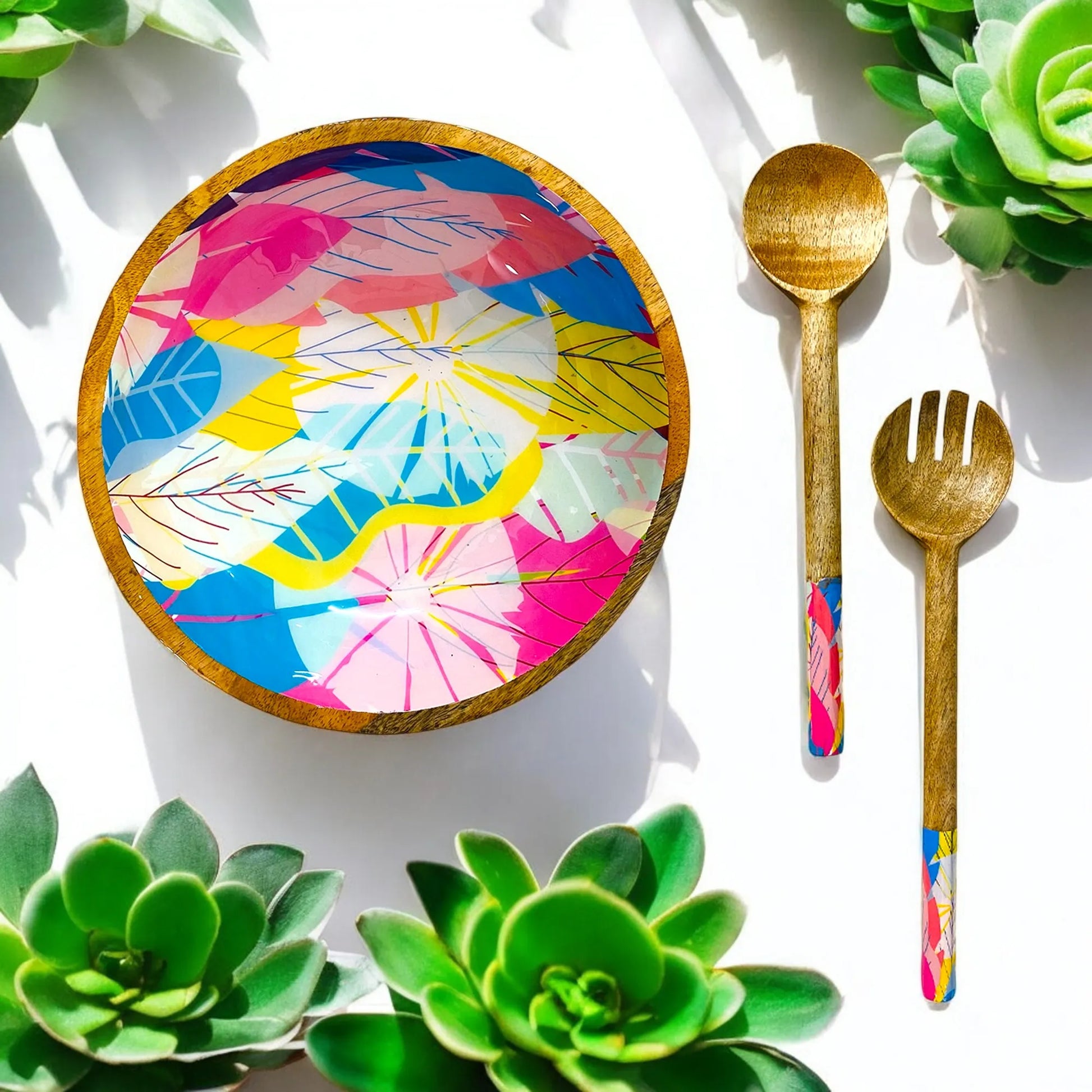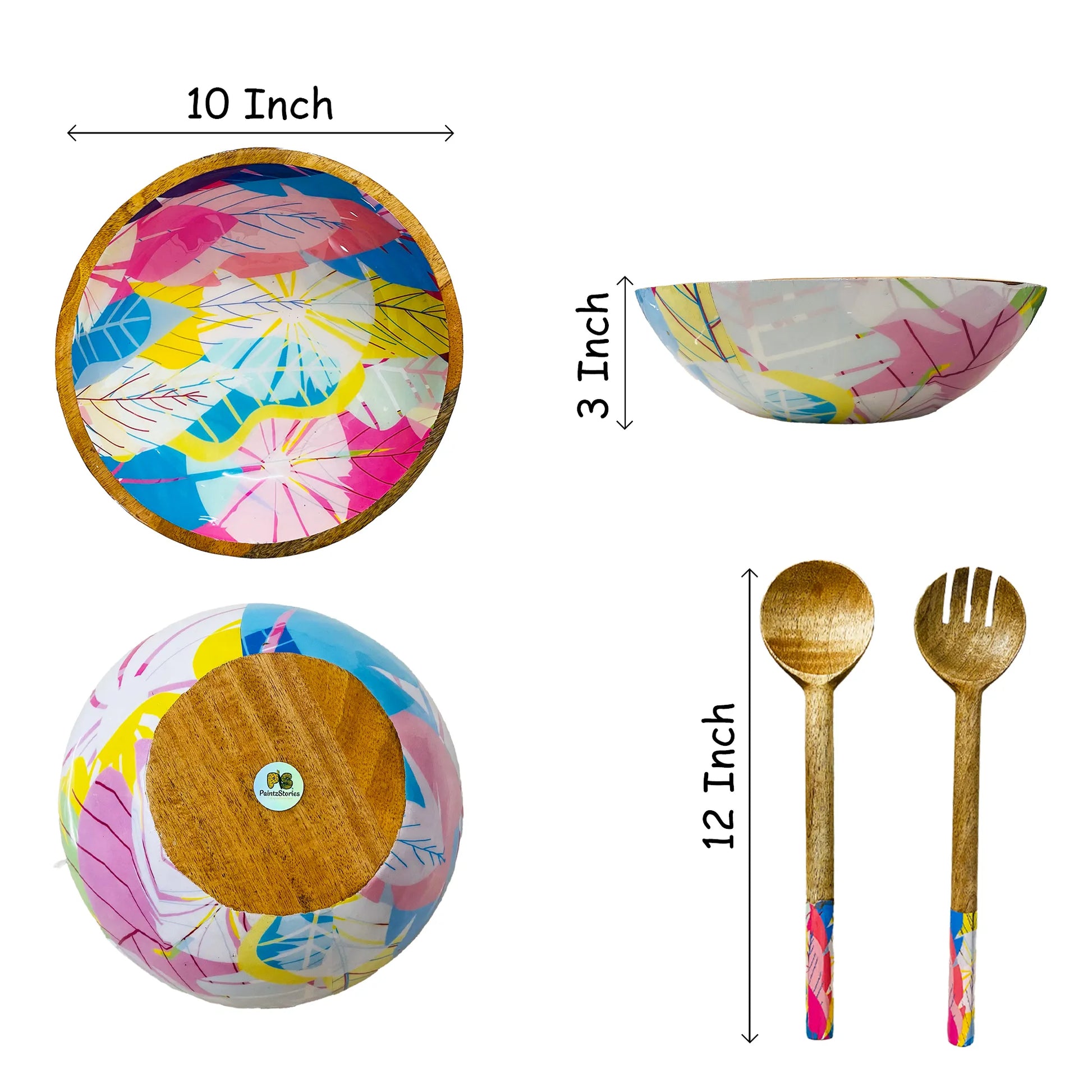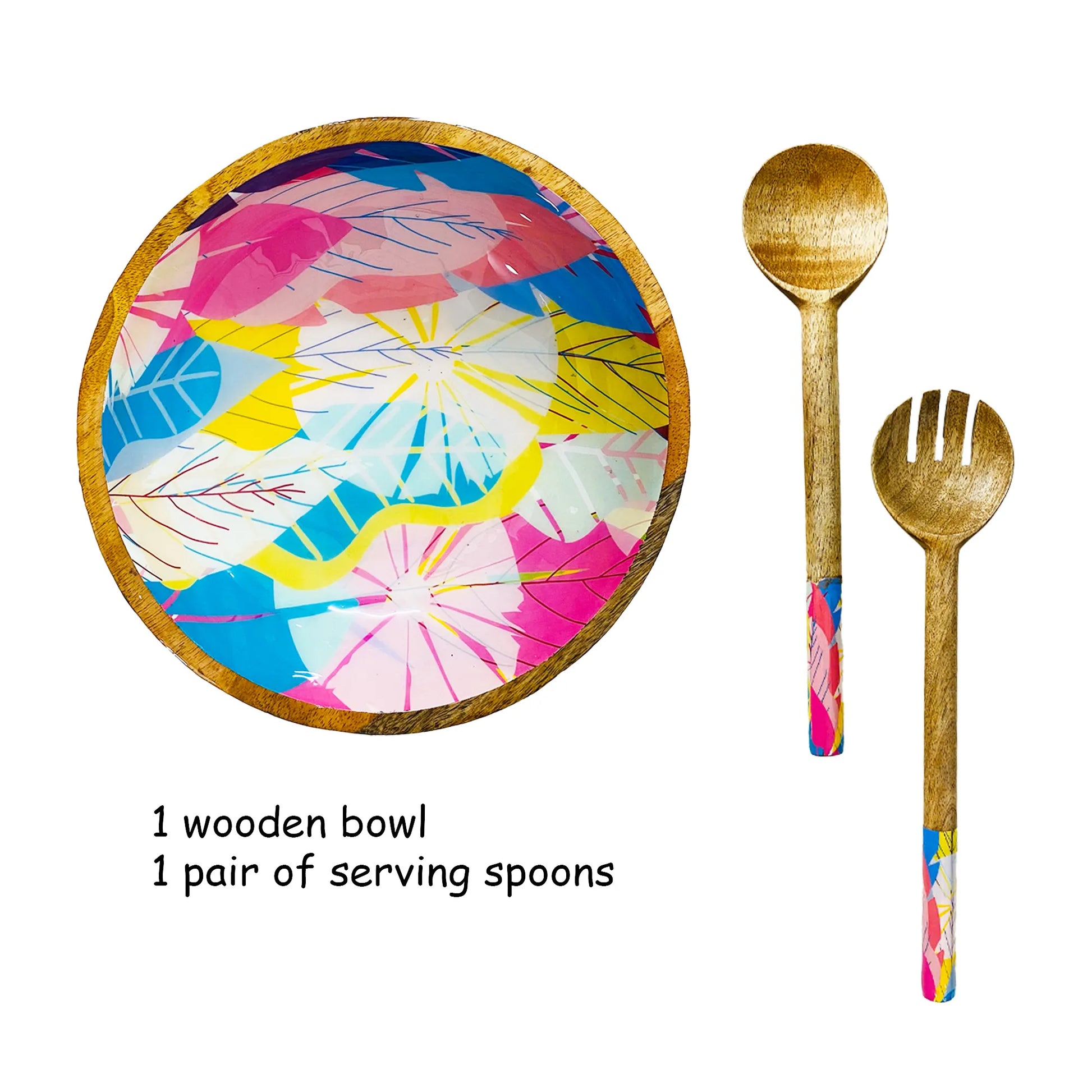 "Cycle of Seasons" Artistic Wooden Cutlery-Big Bowl with Serving Spoons I Dine ware I Living Room Décor I Meena Print I Decorative I Size-10*10*3 Inch