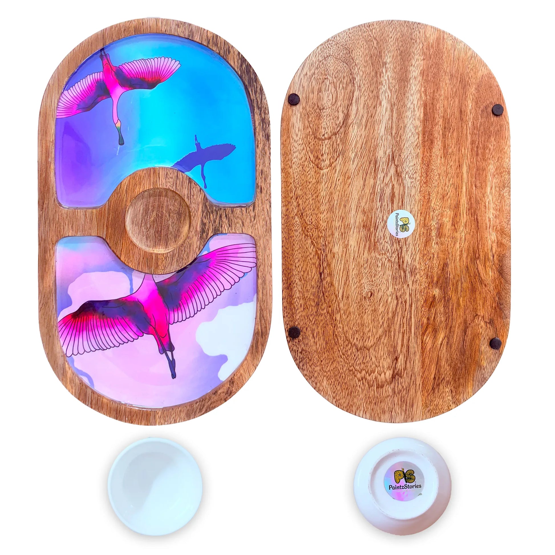 "Stunning birds in a colourful sky" Artistic Wooden Cutlery-Round Platter with Ceramic Bowl I Dine ware I Hand Crafted I Decorative I Size-14*8 Inch