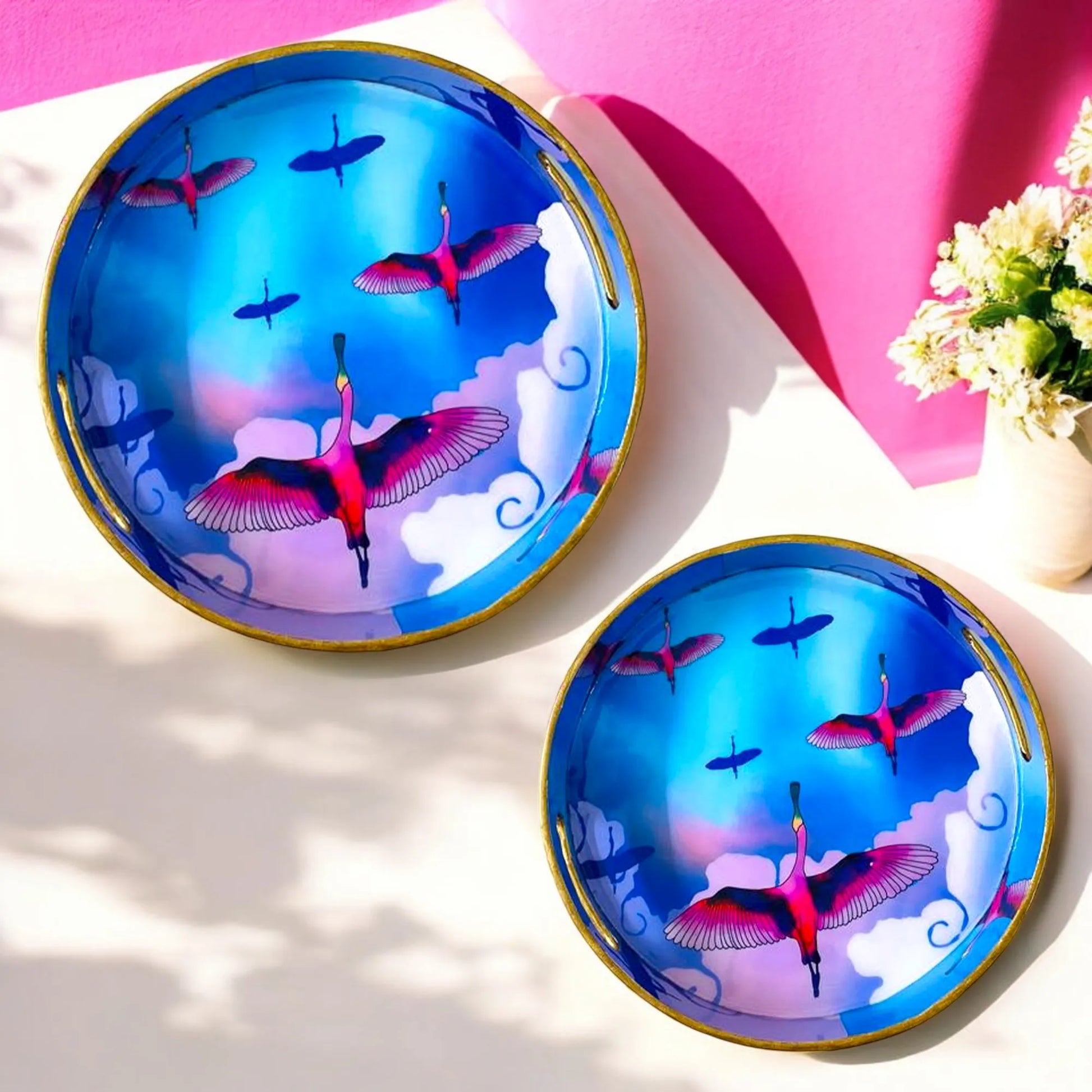'"Stunning birds in a colourful sky" Wooden Cutlery-Round Trays (Set of 2) I Serve ware I Hand Crafted I Meena Print I Size-10*10*2 & 12*12*2 Inch