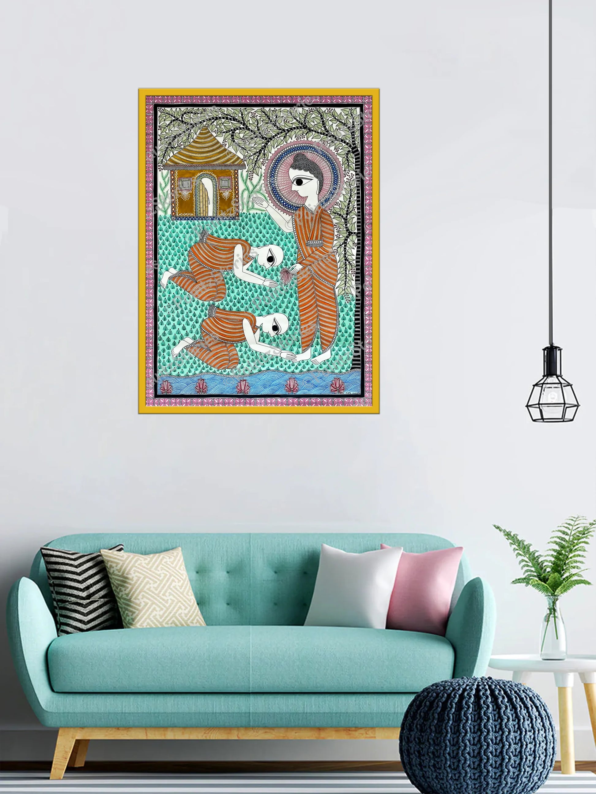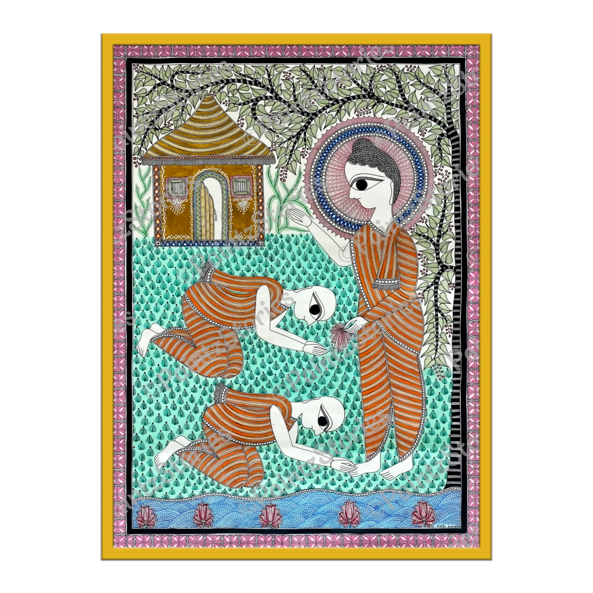 This beautiful Madhubani painting, created by the renowned artist Mr. Pintu from Madhubani, Bihar, beautifully captures the essence of Gautam Buddha.