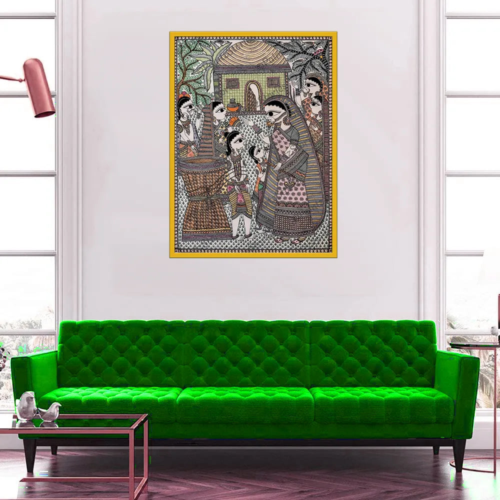 "Immerse yourself in the vibrant tradition of Madhubani painting (also called Mithila painting), where every brushstroke narrates a tale. Our authentic Madhubani artworks epitomize India's cultural richness with intricate designs, vivid hues, and meaningful symbols. Crafted by skilled artisans, each piece is a handmade masterpiece, offering a distinctive touch to your bedroom decor, living room decor, or wall decor, and honouring the artistic heritage of our nation."