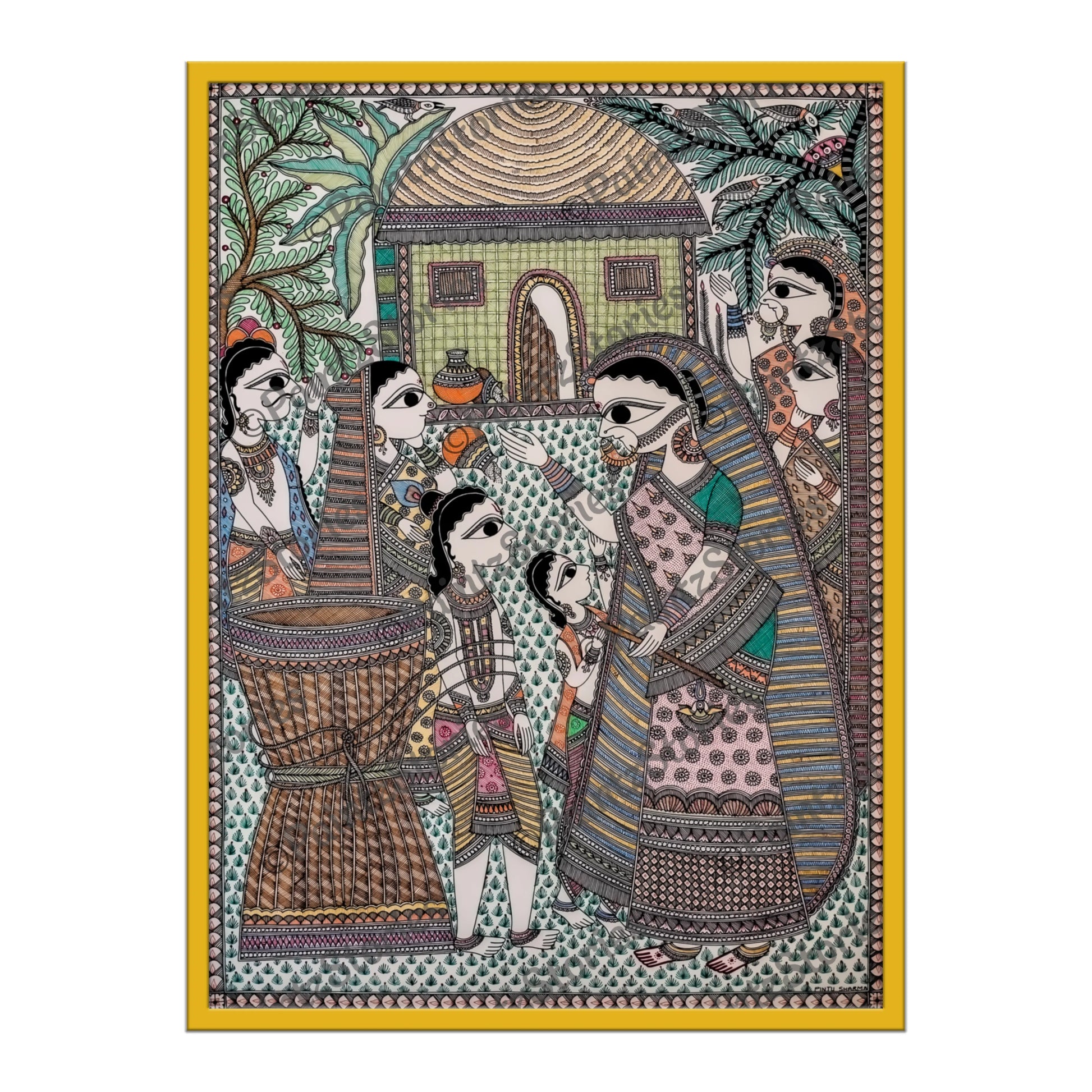 This beautiful Madhubani painting, created by the renowned artist Mr. Pintu from Madhubani, Bihar, beautifully captures the childhood story of Lord Krishna. The Story goes like this.