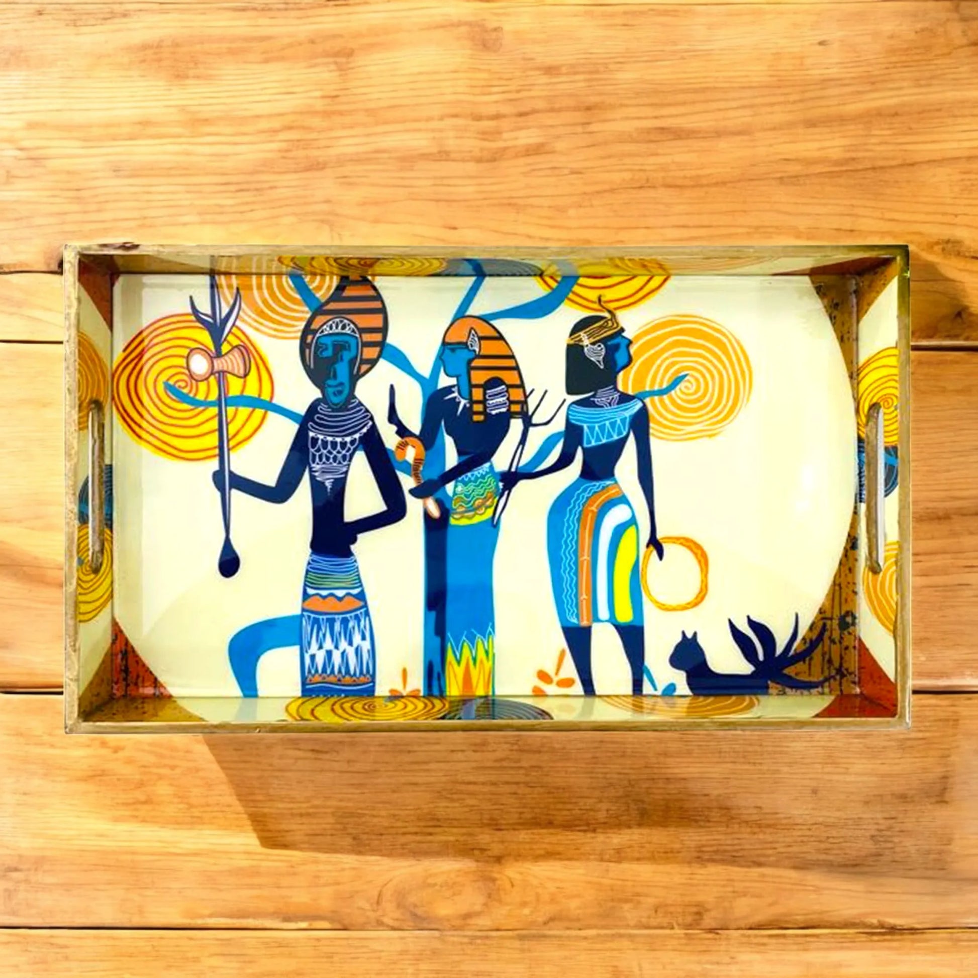 "Egyptian Priestess and Warriors" Artistic Wooden Cutlery-Rectangular Tray- Large I Serve ware I Hand Crafted I Meena Print I Gift I Size-16*10*2 Inch