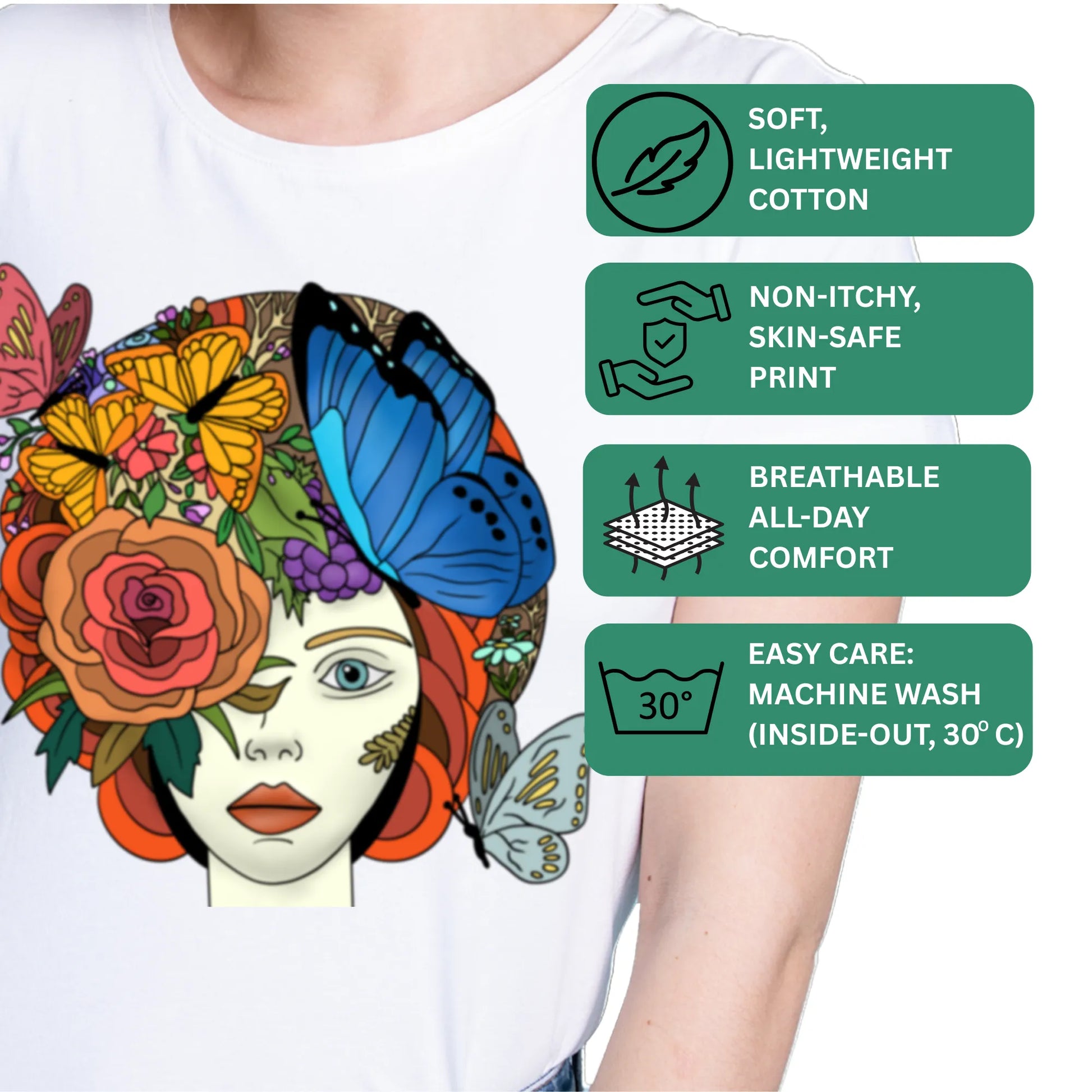 PAINTZSTORIES Butterfly Lady Unisex Cotton Round Neck T-Shirt | Modern Stylish Regular Fit Tee for Men & Women–Soft & Breathable Fabric, Casual Wear, Easy Care, Straight Hem, Comfortable Everyday Fit
