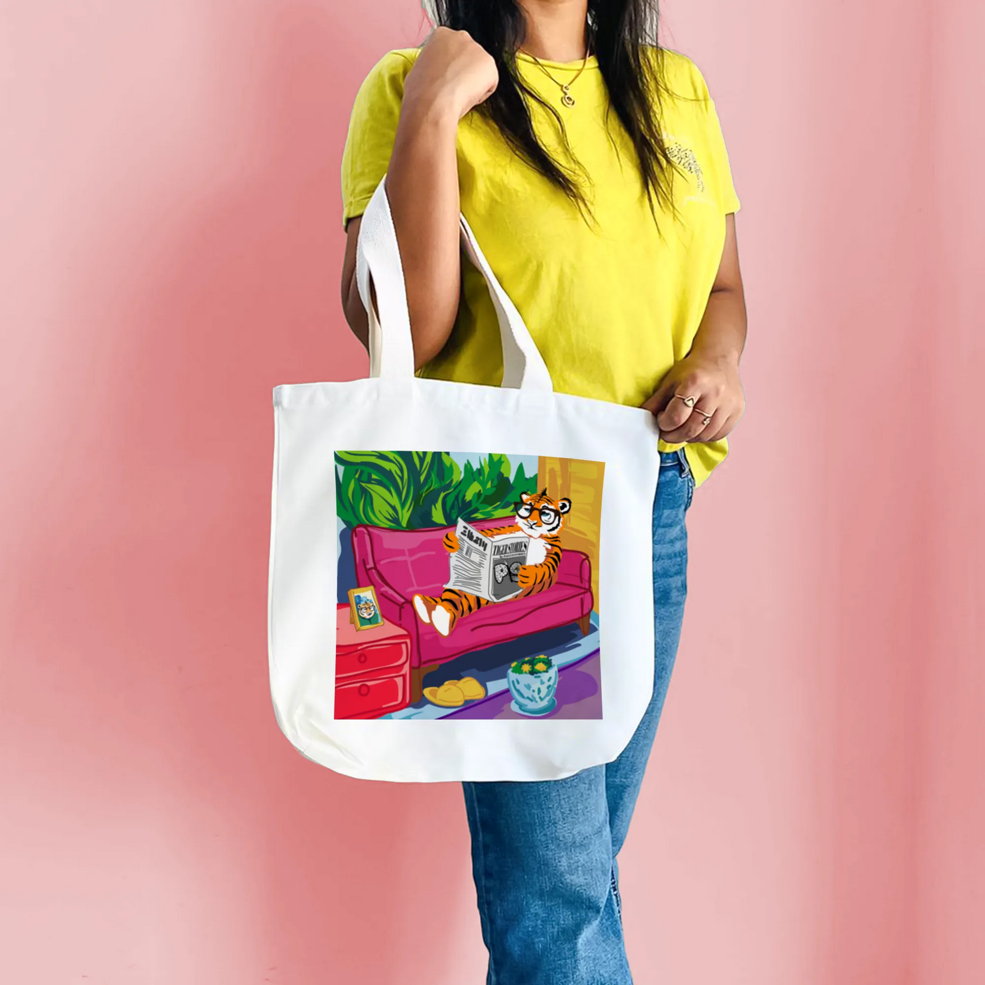 "Tiger's Leisure: Pop Art Illustration of a Relaxing Read" Artistic Tote Bag
