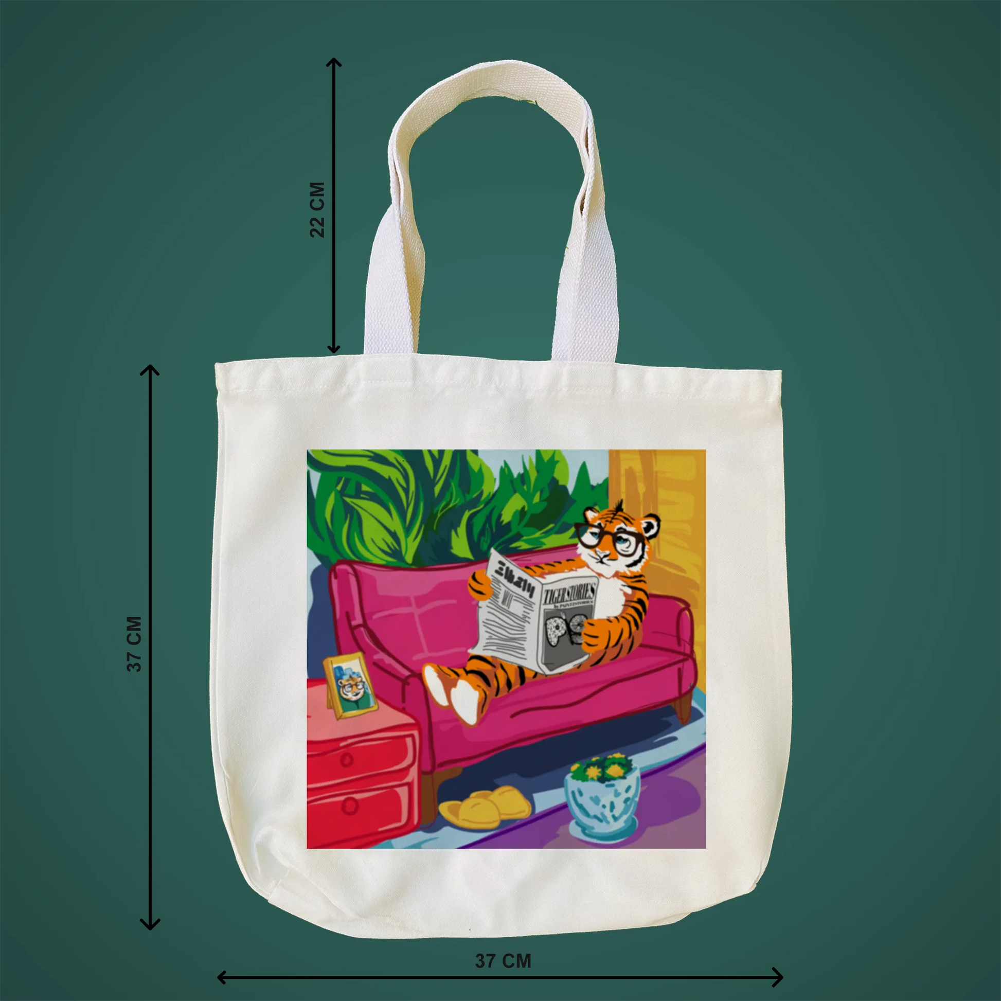 "Tiger's Leisure" is a lively pop art illustration that depicts a tiger enjoying a relaxing moment in a stylish living room. Seated on a long pink sofa, the tiger reads a newspaper featuring the whimsical headline "TIGER STORIES by PAINTZSTORIES." The cozy atmosphere is enhanced by chic green plant-themed wallpaper, which complements the bold colors of the decor. This playful scene combines the wild and the domestic, inviting viewers to envision a tiger savouring the comforts of modern life. With its humorous approach and vibrant details, "Tiger's Leisure" is a delightful piece that celebrates relaxation in the most unexpected way.